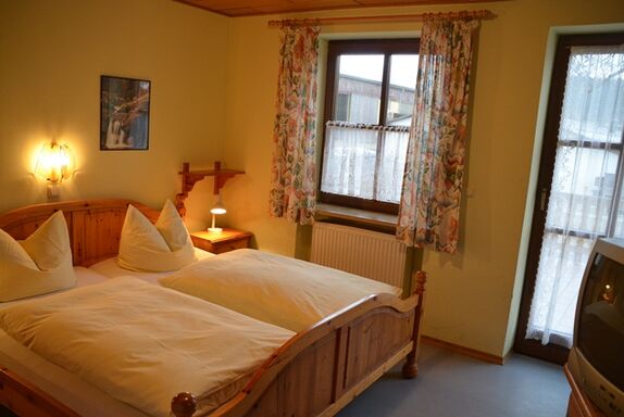 Hier wohnen Sie in einem Doppelzimmer (ca. 20 qm). Sie haben Zugang zu einer Gemeinschaftsterrasse. Sie haben ein gemütliches Doppelbett (keine Klappcouch!), einen TV und eine kleinen Küchenersatz (Zwei-Platten-Herd, Kühlschrank, Kaffeemaschine und einiges an Eßgeschirr). Im Badezimmer gibt es Dusche, WC und ein Waschbecken. Bettwäsche einmalig und Endreinigung ist im Preis bereits enthalten so wie noch zahlreiche weitere Extras bei uns auf dem Hof.