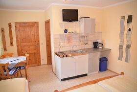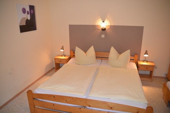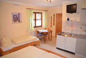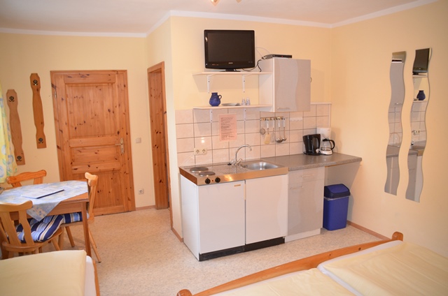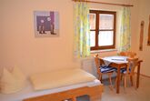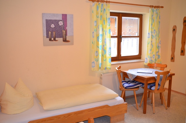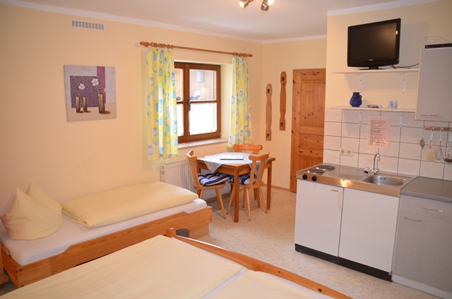 Hier wohnen Sie und Ihre Lieben in einem Drei-Bett-Zimmer. Der kombinierte Wohn- Schlafbereich hat ein gemütliches Doppelbett (keine Klappcouch!), ein Einzelbett, einen TV, eine Essecke und eine Miniküche. Die Miniküche hat einen Zwei-Platten-Herd, Kühlschrank, Spülbecken, Kaffeemaschine und eine gute Grundausstattung an Geschirr. Im Badezimmer gibt es Dusche, WC und ein Waschbecken. Es steht Ihnen ein Terrassentisch mit Blick auf den Sattelplatz im Innenhof zur Verfüttwäsche einmalig und Endreinigung ist im Preis bereits enthalten so wie noch zahlreiche weitere Extras bei uns auf dem Hof. Falls benötigt, stellen wir gerne kostenlos ein Baby-Gitterbettchen im Zimmer für Sie bereit.