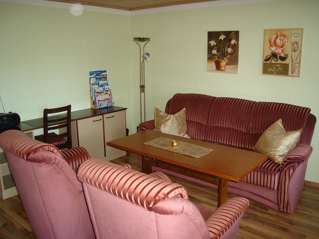 Großzügige Ferienwohnung auf dem Land, 75 qm für 2 - 5 Personen, Wohnzimmer mit zwei Schlafgelegenheiten und rückengerechter Couchgarnitur, 1 Doppelzimmer, 1 Einbettzimmer, kleine Küche, großes Badezimmer, Balkon mit gemütlicher Sitzecke, Parkplatz direkt vor dem Haus, SAT-TV und Radio, kostenloses WLAN, Brötchenservice, 10 Min. in die Therme Bad Birnbach und Golfplatz, 5 Min. zum kostenlosen Freibad Triftern.
