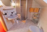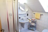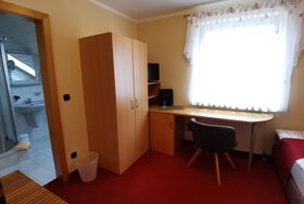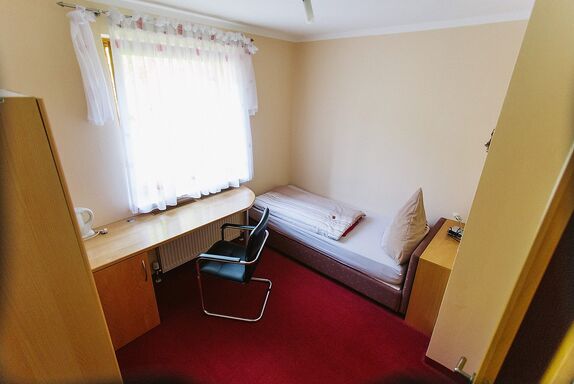 Das kleine Einzelzimmer hat ein Fenster nach Norden, Boxspringbett, Schreibtisch,TV und WLAN. Das Badezimmer ist mit Dachfenster, Dusche, WC, Fön und Handtüchern ausgestattet.