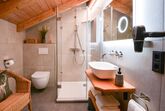 Badezimmer mit Regenschauer-Dusche, eigener möblierter Balkon mit Silberbergblick.