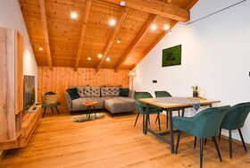 Die Ferienwohnung besteht aus Wohn-Esszimmer, mit komplett eingerichteter Küchenzeile inklusive Spülmaschine und Mikrowelle. Ebenfalls gibt es einen Kaffeevollautomat.