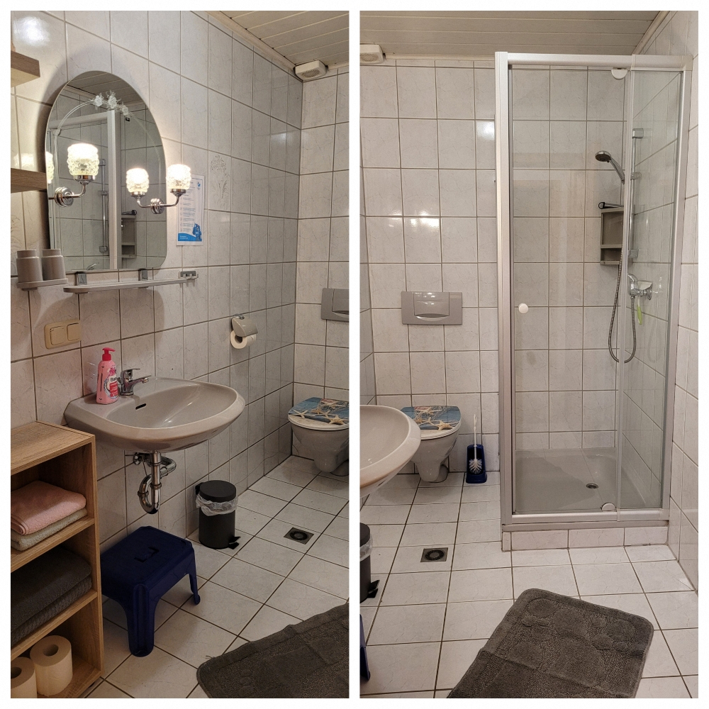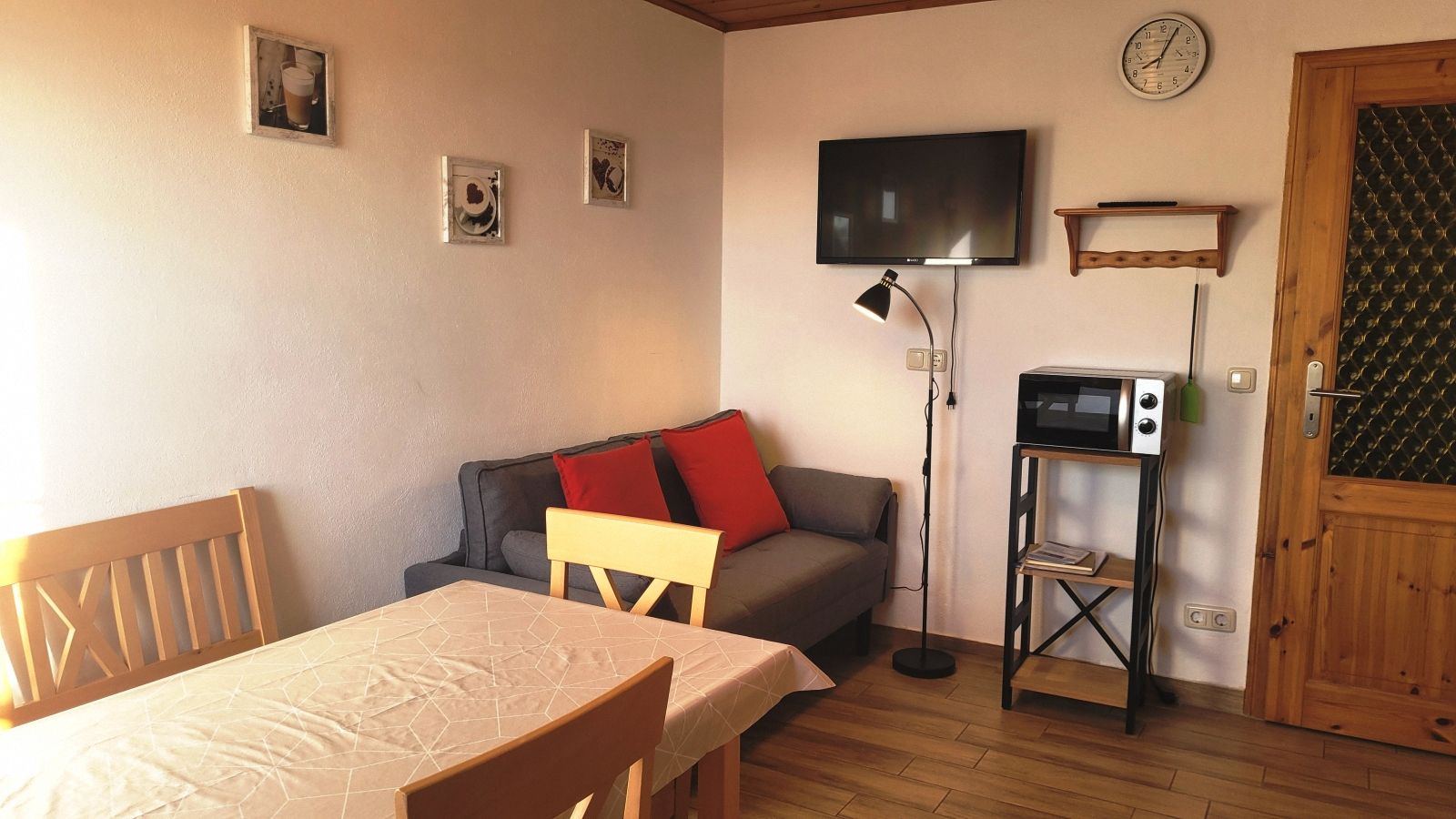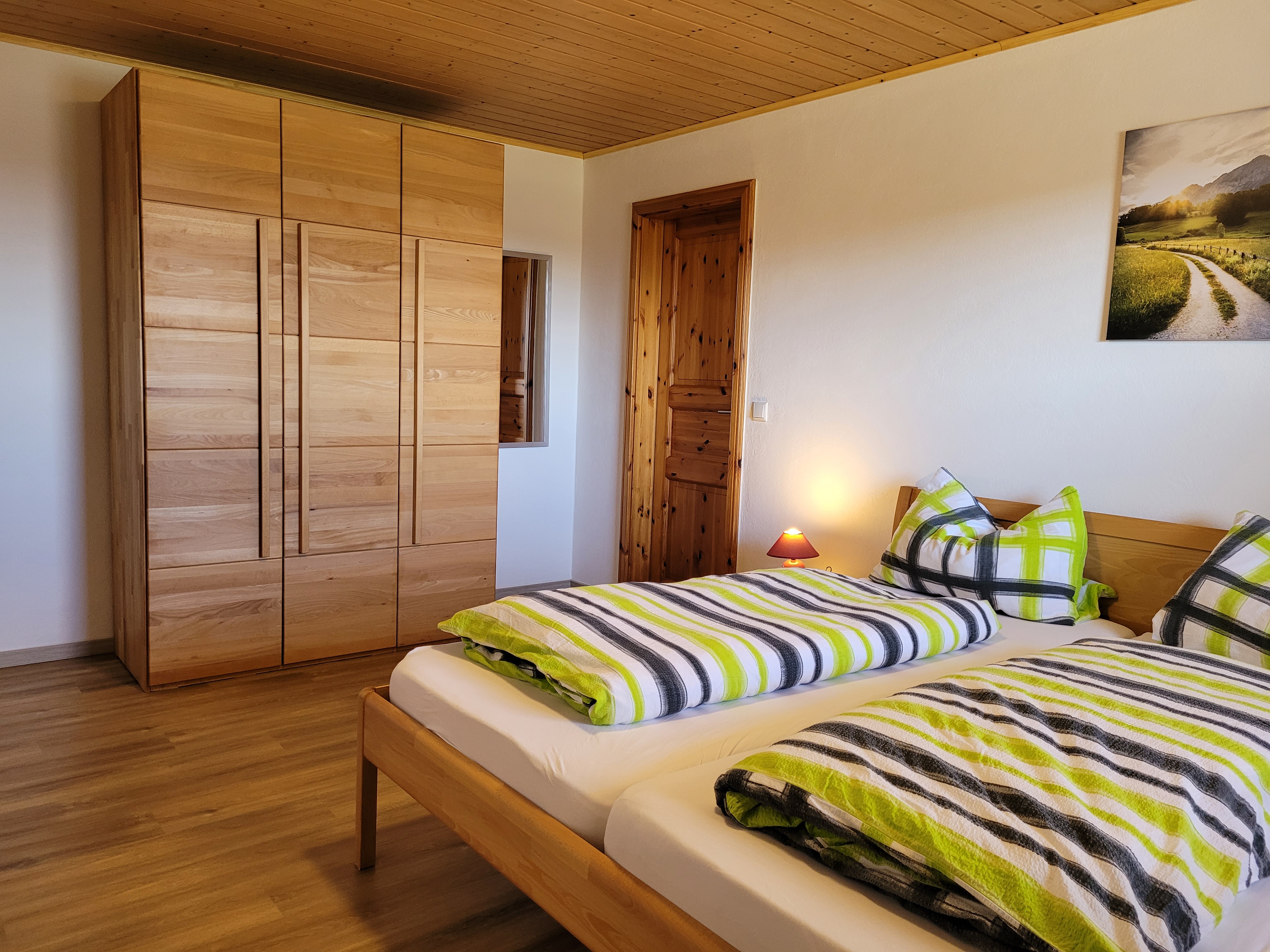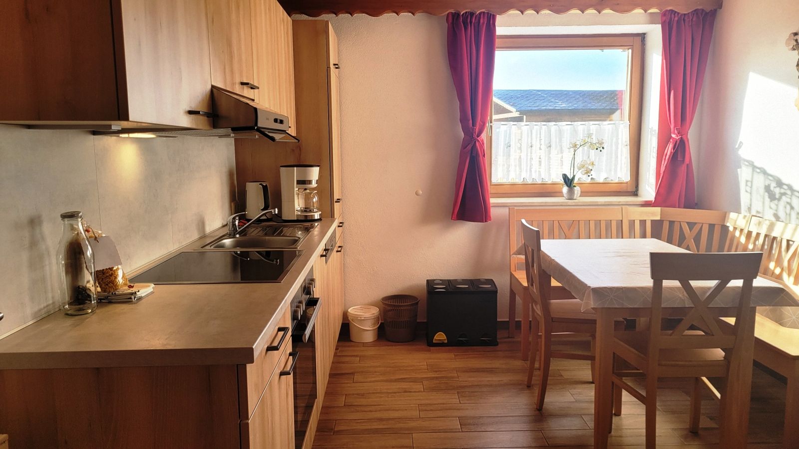 Gemütliche Ferienwohnung mit 2 Schlafzimmern, Wohnküche, Dusche. Verbindungstür zum Kinderzimmer, im Kinderzimmer ein Etagenbett und ein Einzelbett.