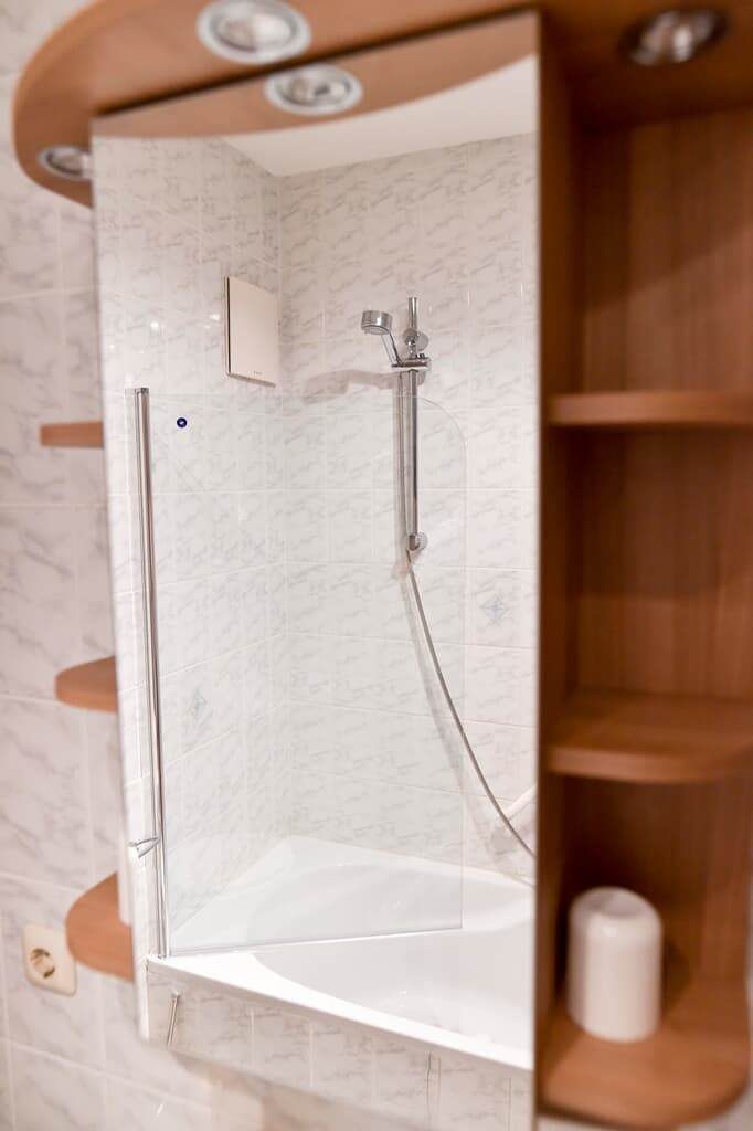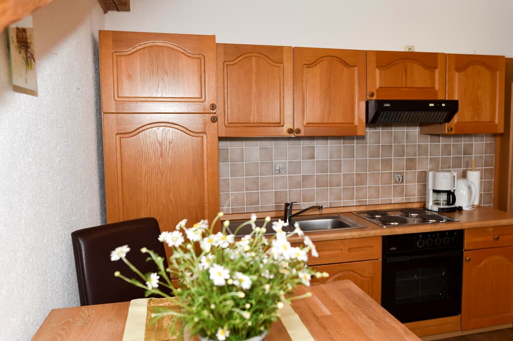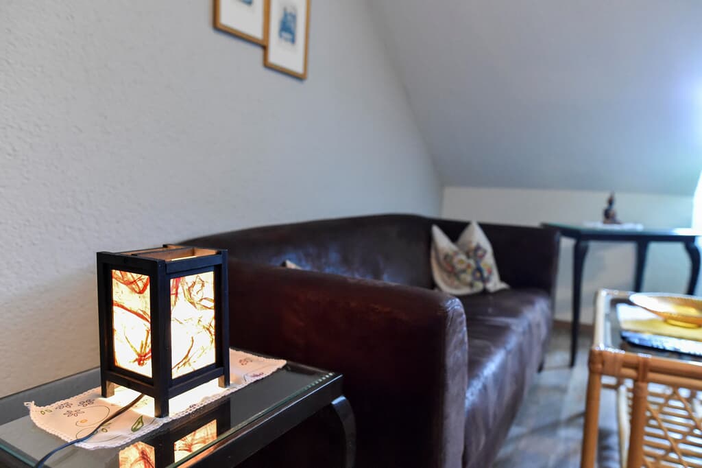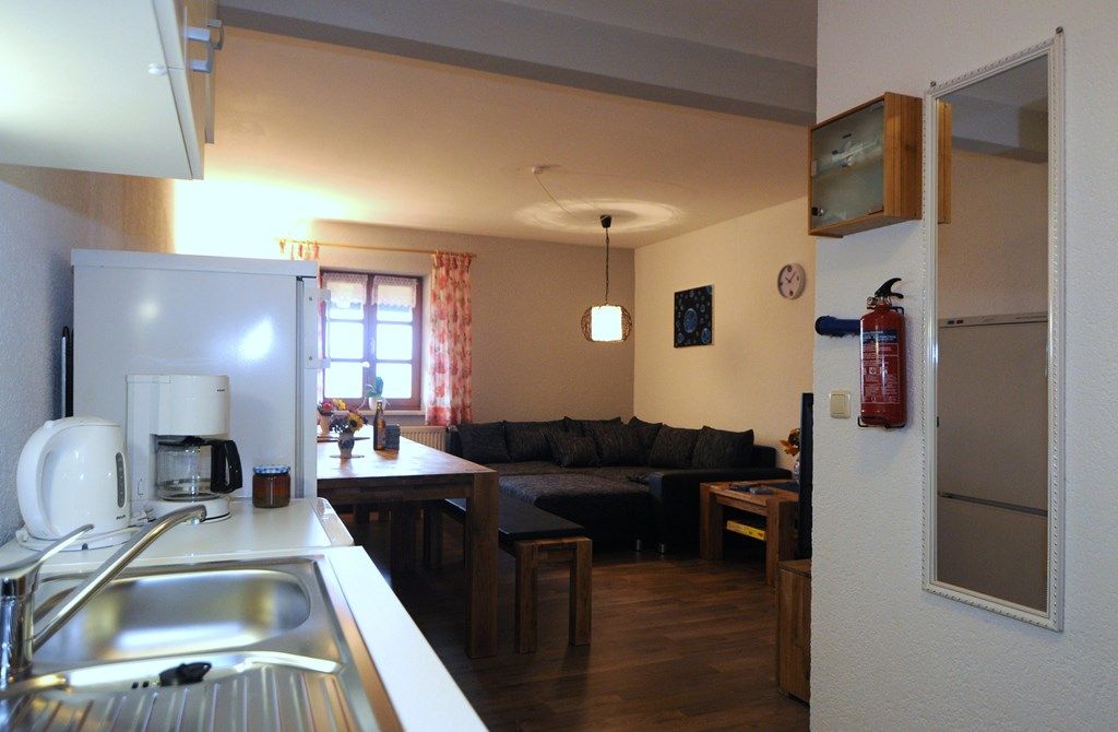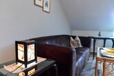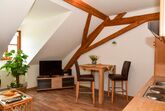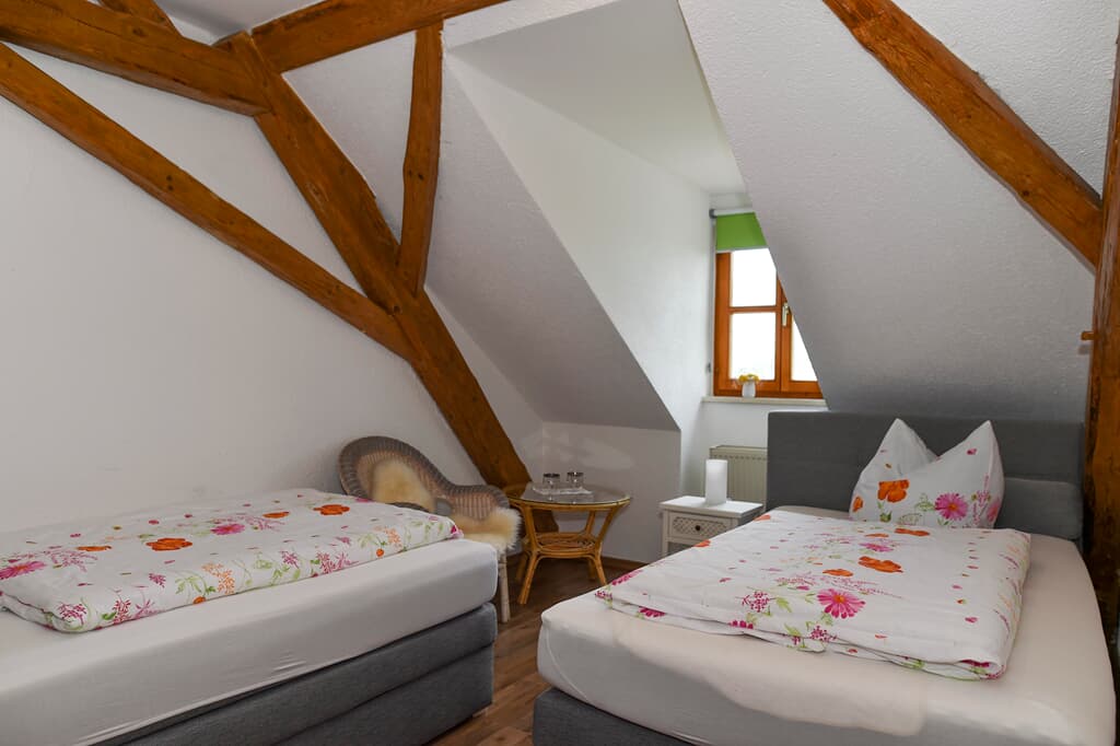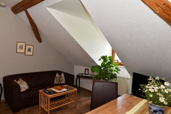 Die stilvolle Mansarden-Ferienwohnung Nr.4 (30qm, Obergeschoß) mit Sichtbalken und Dachgauben ist bestens geeignet für ein bis zwei Personen. Im Schlafzimmer stehen zwei getrennte Boxspringbetten mit offenem Fußteil die bei Ihrer Anreise bezogen sind. Im Wohnzimmer läd ein Sofa zum TV schauen oder zum Musikhören ein. Die Küchenzeile mit Backofen und Cerankochfeld sowie Kühlschrank samt Gefrierfach und Kaffeemaschine/Wasserkocher/Toaster ist praktisch ausgestattet. Für Sie vorbereitet sind Spül-und Geschirrtücher. Einen speziellen Platz bietet der hohe Eßtisch mit zwei Barstühle. Im Bad mit Badewanne/Dusche inklusiv und WC sind Bade-und Handtücher und ein Fön für Sie bereitgelegt. Im Eingangsbereich der Wohnung sorgt eine Gardarobe für Ordnung. In der großen Scheune ist genug Platz um Ihre Fahrräder oder Motorräder kostenlos unterzustellen.