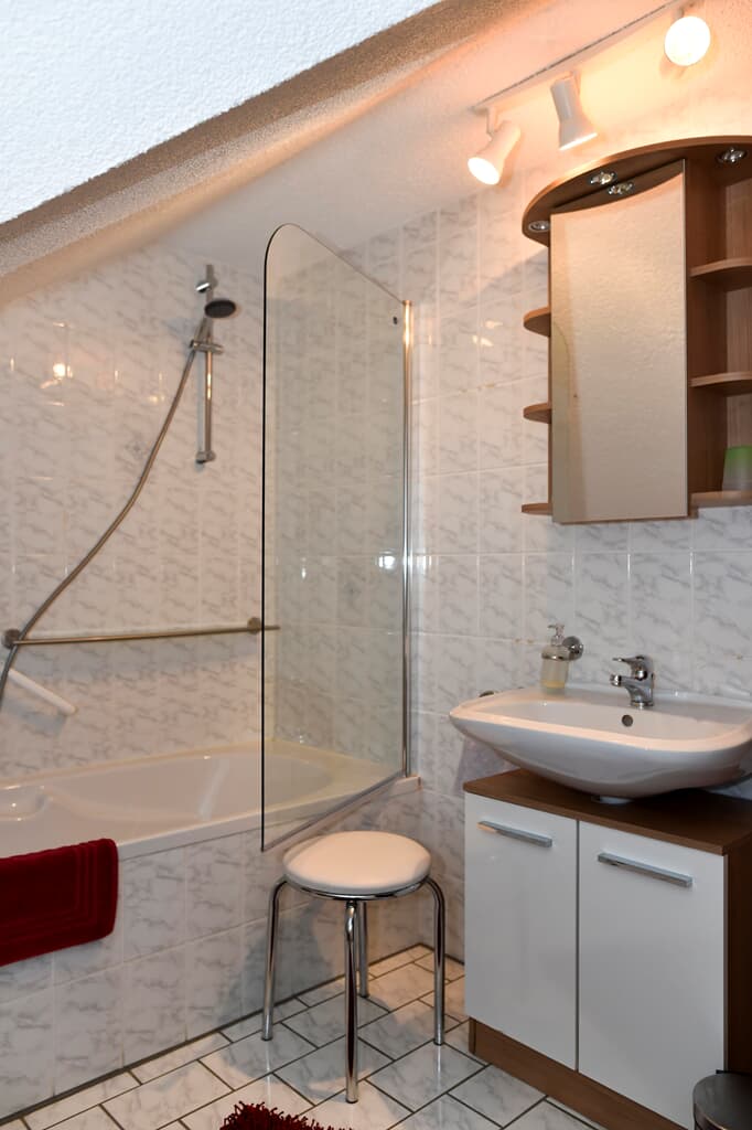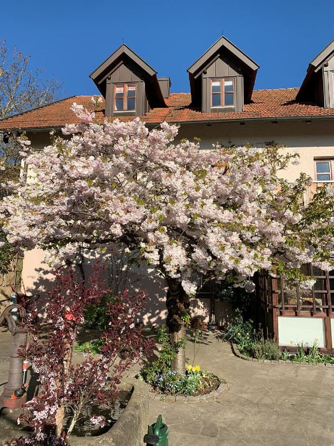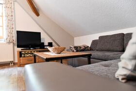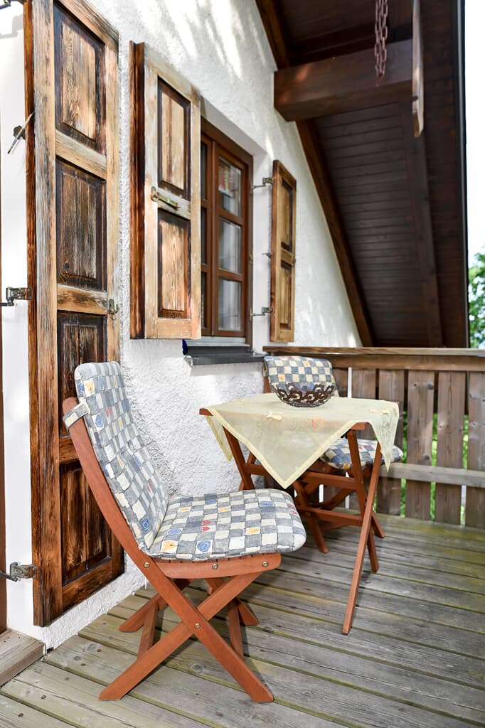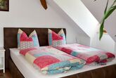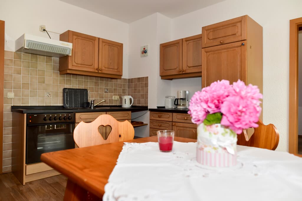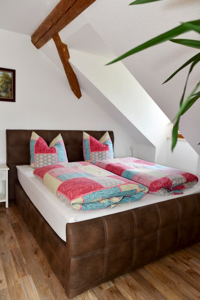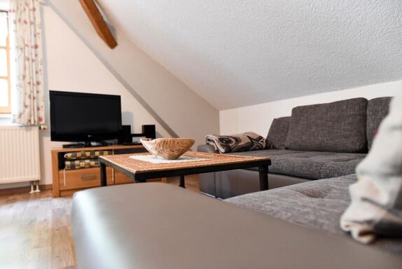 Freundliche, gemütliche, renovierte Ferienwohnung Nr.5 (40qm, Obergeschoß) mit Sichtbalken im Landhausstil und Süd-Balkon. Ideale Wohnung für zwei Personen die gerne auf dem Balkon die Sonne geniesen. Im Wohnbereich lädt eine Eckcouch bei TV oder Musik zum entspannen ein. Die Wohnküche ist mit einem Backofen mitsamt Cerankochfeld sowie Kühlschrank inklusiv Gefrierfach und Kaffeemaschine/Wasserkocher/Toaster praktisch eingerichtet. Geschirr-und Spültücher liegen bereit. Einen hellen, gemütlichen Platz bietet der Esstisch. Ausgestattet ist das Schlafzimmer mittels einem Boxspringdoppelbett samt offenem Fußteil, das bei Ihrer Anreise bezogen ist. Im Bad mit Badewanne/Dusche inklusiv und WC liegen Bade-und Handtücher und ein Fön bereit. Für Ordnung sorgt eine Gardarobe im Vorraum. Die große Scheune bietet genug Platz für Ihre Fahrräder oder Motorräder zum kostenlosen Unterstellen.