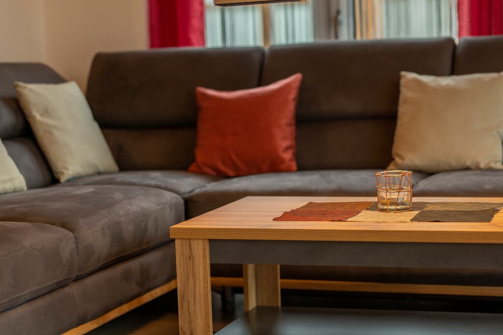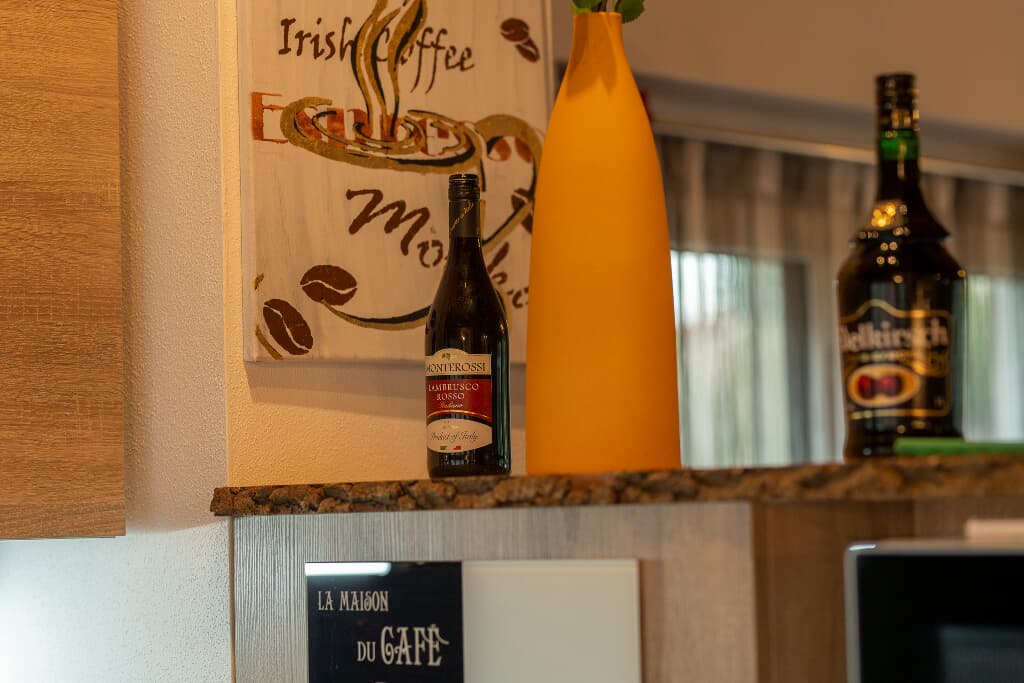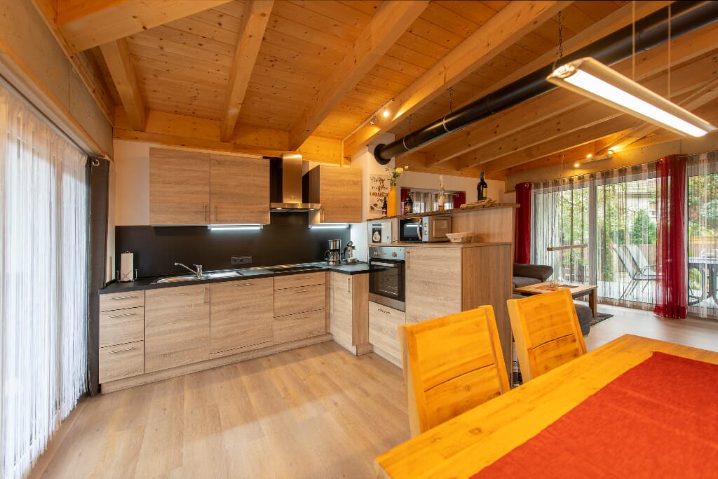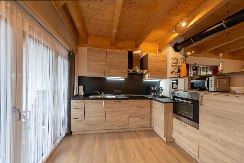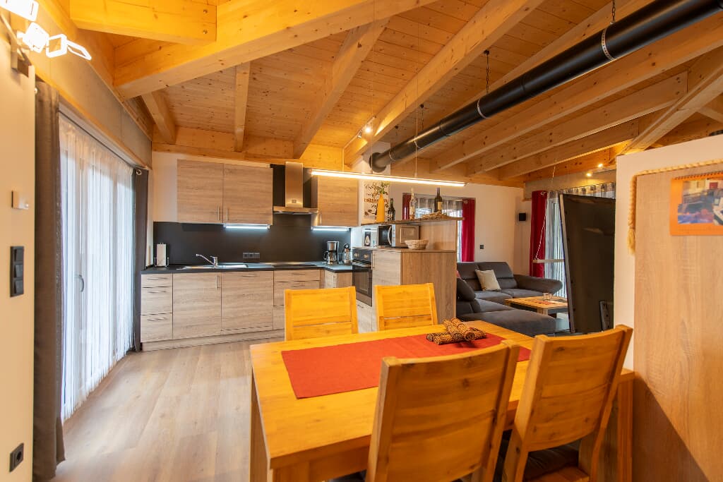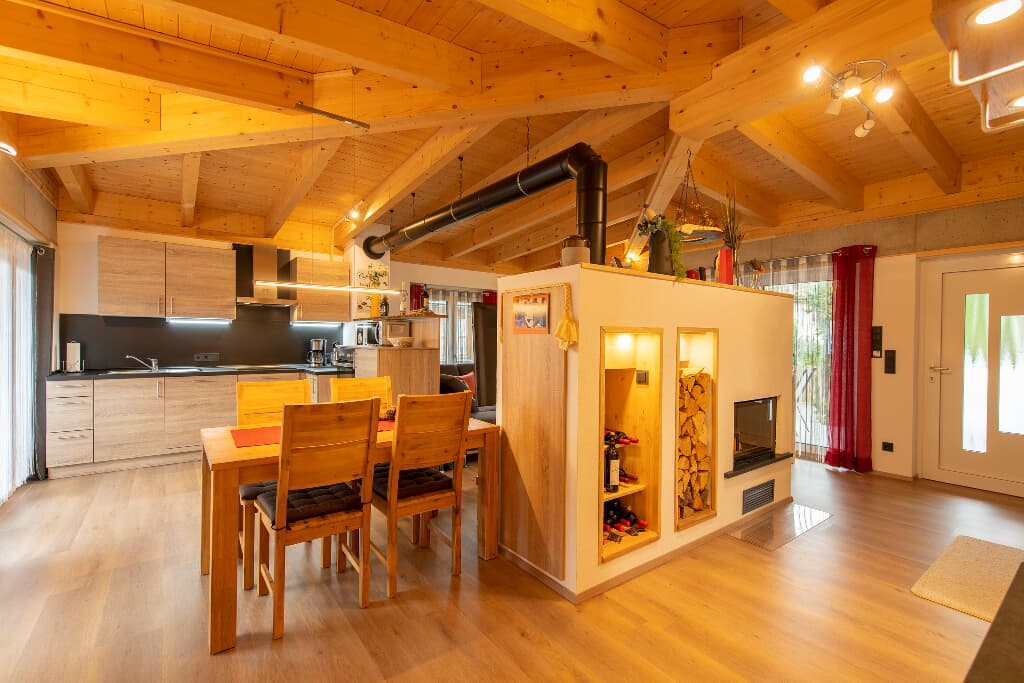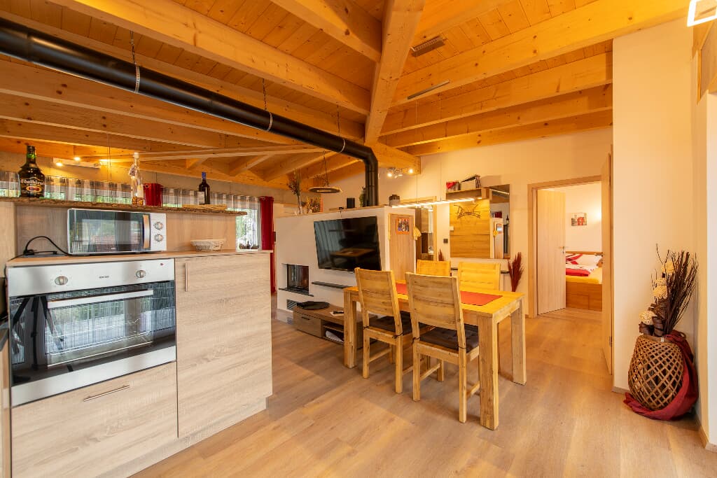 Der gemütliche Wohnbereich mit Kachelofen und „integrierten Weinregal“ mit edlen Weinen lassen so manchen Abend auf der Terrasse oder Balkon besinnlich ausklingen. Auch in der Küche wird es Ihnen an nichts fehlen, dafür sorgt am morgen ein Frühstückscenter mit Kaffeemaschine, Tee-Zubereiter und Doppeltoaster. Ein vierplatten-Cerankochfeld mit Backofen unterstützt Sie bei der Zubereitung Ihrer Speisen.