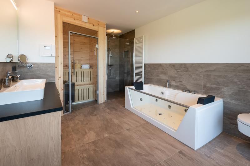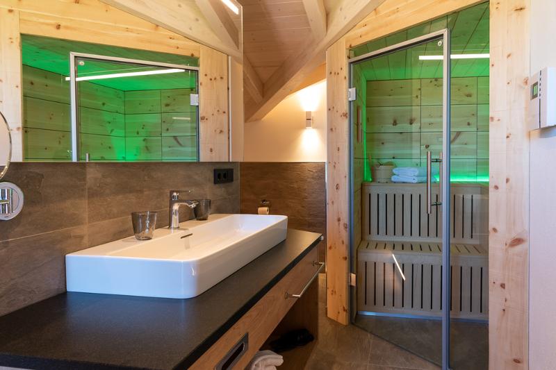 Bad mit Panoramafenster, begehbare Dusche, WC, Whirlwanne. Zirbenholzsauna im Badezimmer. TV im Wohn- und Schlafzimmer