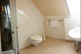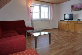 Die Ferienwohnung (102qm) befindet sich im Obergeschoss und bietet großzügige Räume mit gehobenem Komfort. Wohnzimmer 25qm mit Farb-TV, Radio mit CD und MC, Telefon, WLAN, Küche 14,3qm mit Küchenzeile und Geschirrspüler, Kinderzimmer 20qm (Dachzimmer) und mit eigenem Bad 5qm, Schlafzimmer 18,5qm mit Doppelbett und Klappsofa, Bad 6,8qm mit Badewannwe, Dusche und WC, Diele 6,3qm mit Garderobe und Schuhschrank, Überdachter Balkon 6,4qm mit Möbel, Das Kinderzimmer liegt über der Wohnung.