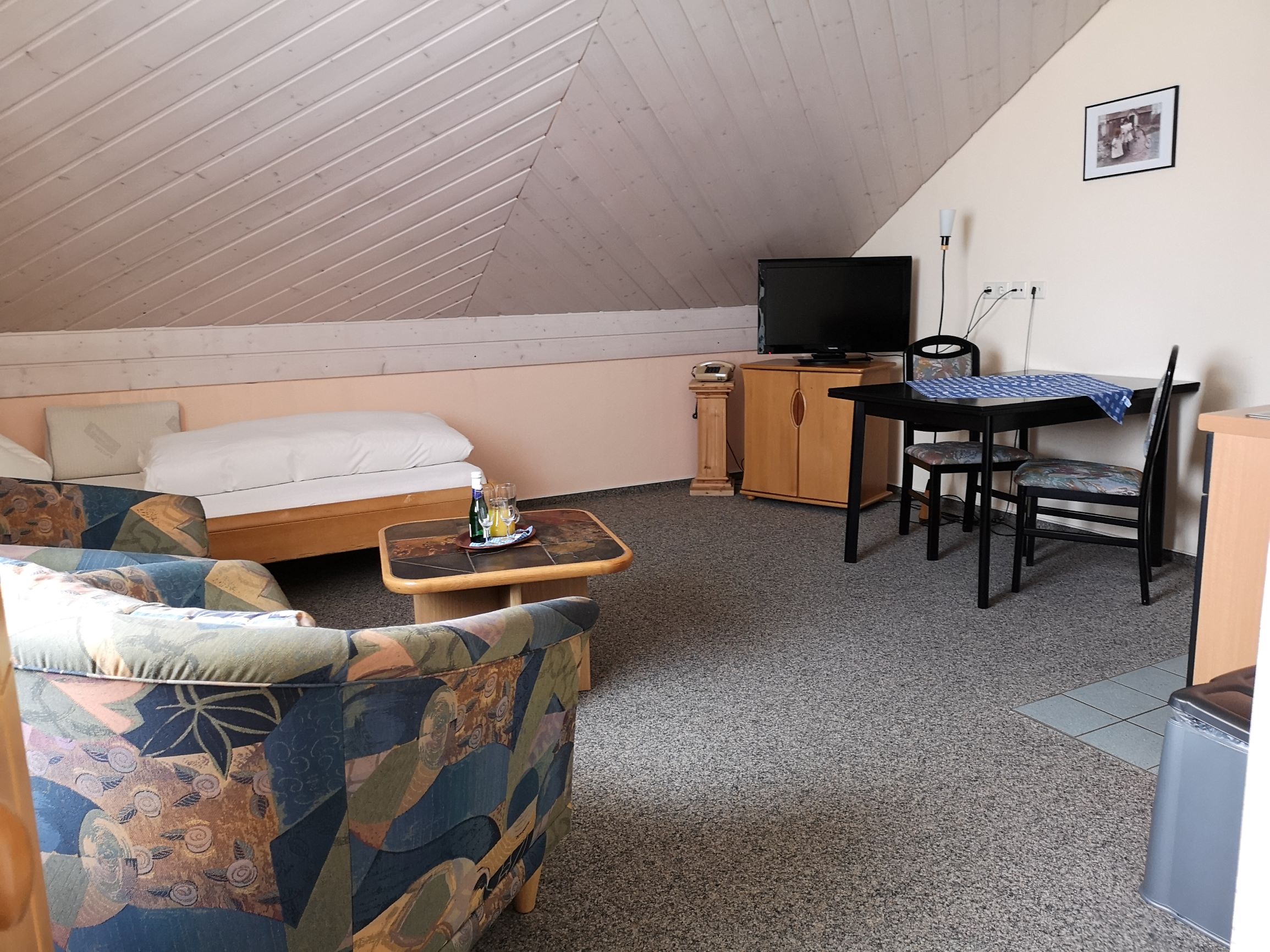 Unser geräumiges Einzel-Appartement verfügt über einen komfortablen Wohn-/Schlafraum, ein eigenes Badezimmer und einen Balkon. Für einen gesunden Schlaf, sind all unsere Betten mit Bandscheibenmatratzen ausgestattet.