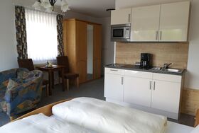 Bei den Appartements und Ferienwohnungen bieten wir eine komplett ausgestattete Küchenzeile mit Ceran-Kochfeld, Kühlschrank mit Gefrierfach, Kaffeemaschine, Wasserkocher und Toaster. Die Appartements verfügen zusätzlich noch über eine Mikrowelle. Bademäntel bieten wir auf Wunsch gegen eine geringe Gebühr an.