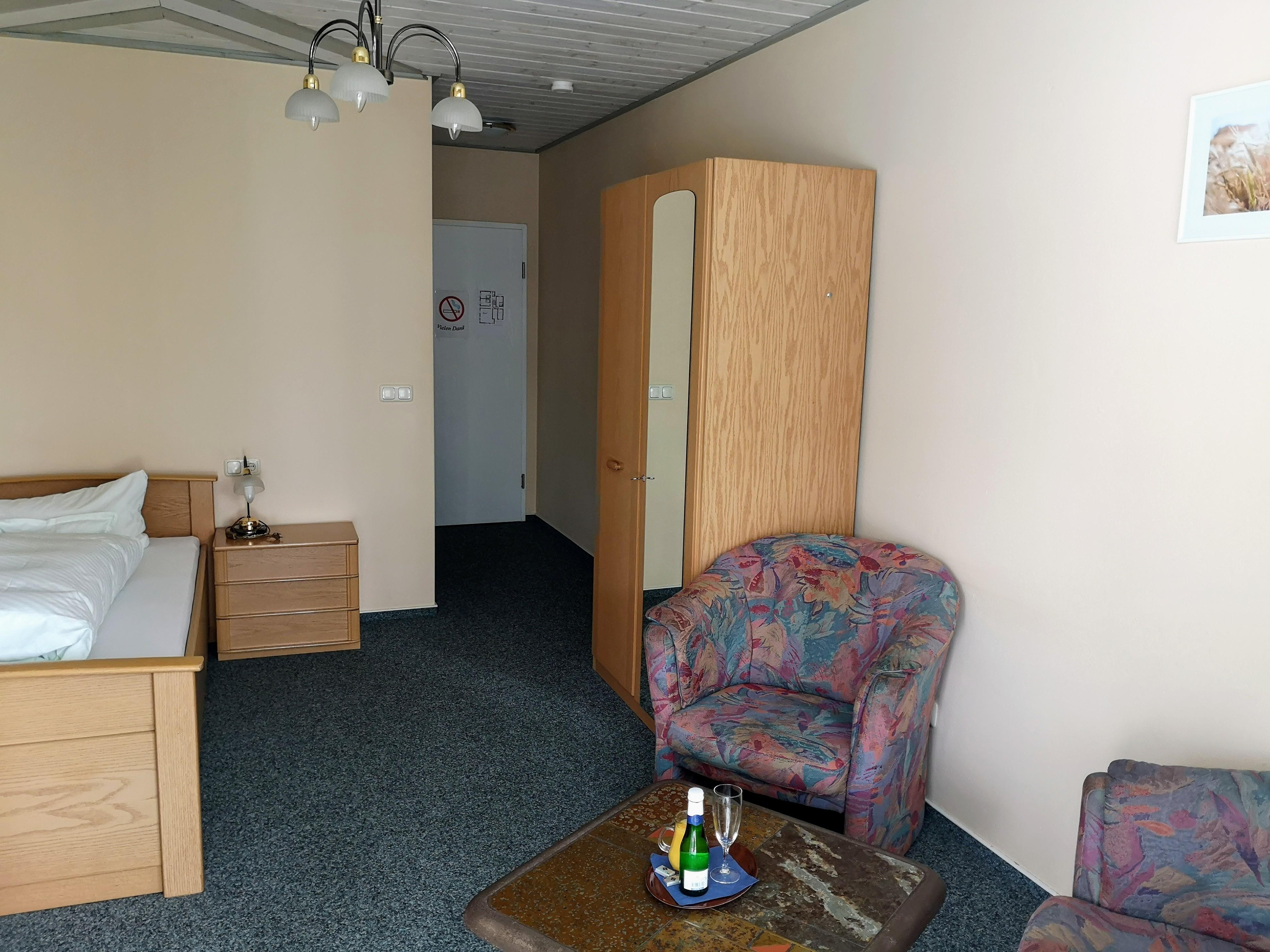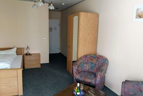 Das helle und geräumige Einzelzimmer mit 21qm verfügt über ein Einzelbett. Auf den gemütlichen Sitzgelegenheiten mit TV können Sie entspannte Abende verbringen. Das Badezimmer mit Dusche, WC und Fön rundet das Gesamtbild ab. Bitte beachten Sie, dass keine Haustiere erlaubt sind. Das WLAN und den Parkplatz vor dem Haus können Sie kostenfrei nutzen.