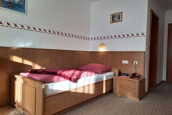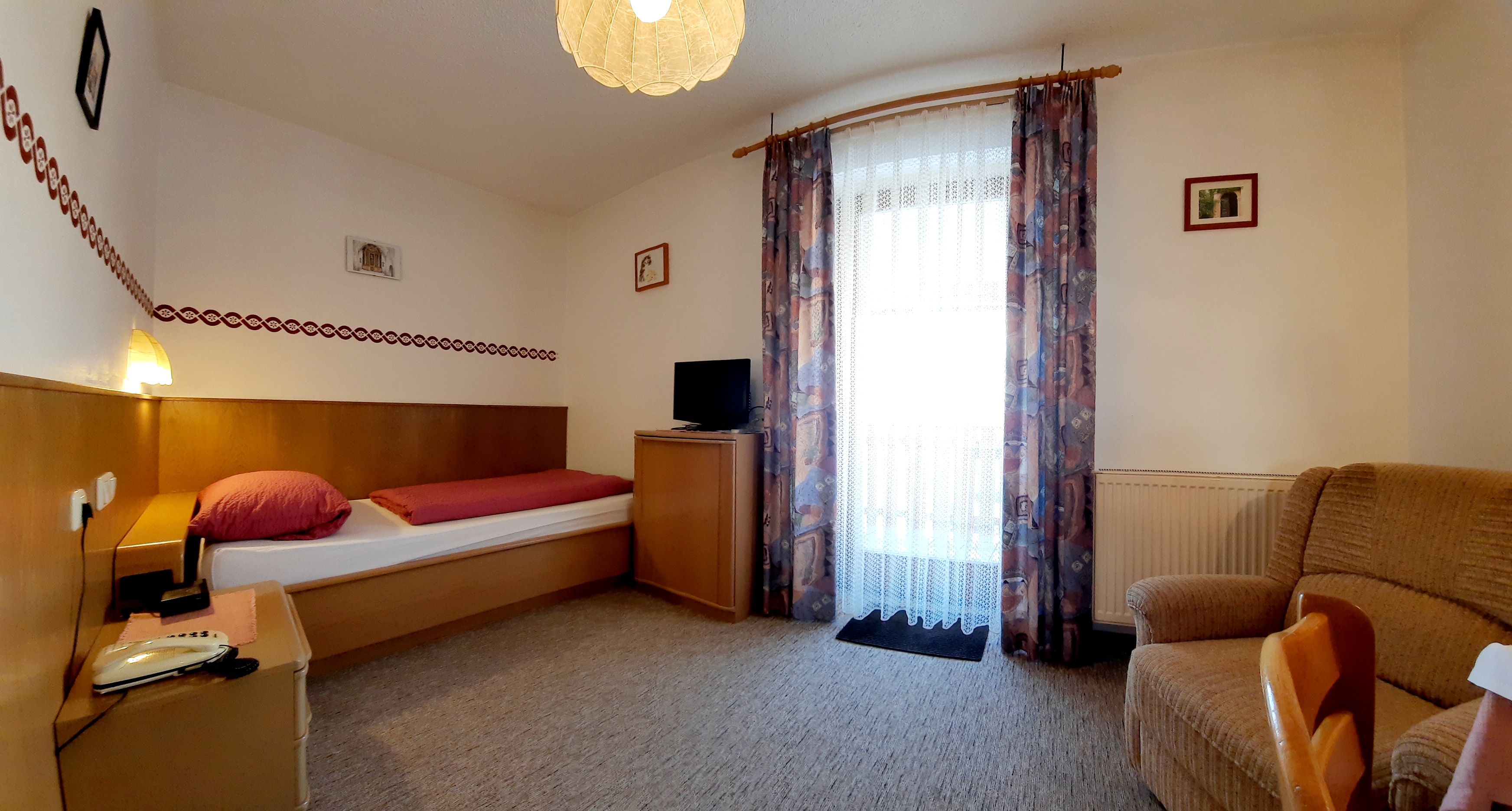 Alle Einzelzimmer haben einen Balkon mit bequemen Liegestuhl, 1 davon mit Blick auf den Gartenteich. Auf Wunsch bieten wir Ihnen Zimmer ohne Fernseher an - der Preis pro Nacht verringert sich dann um 2 €.