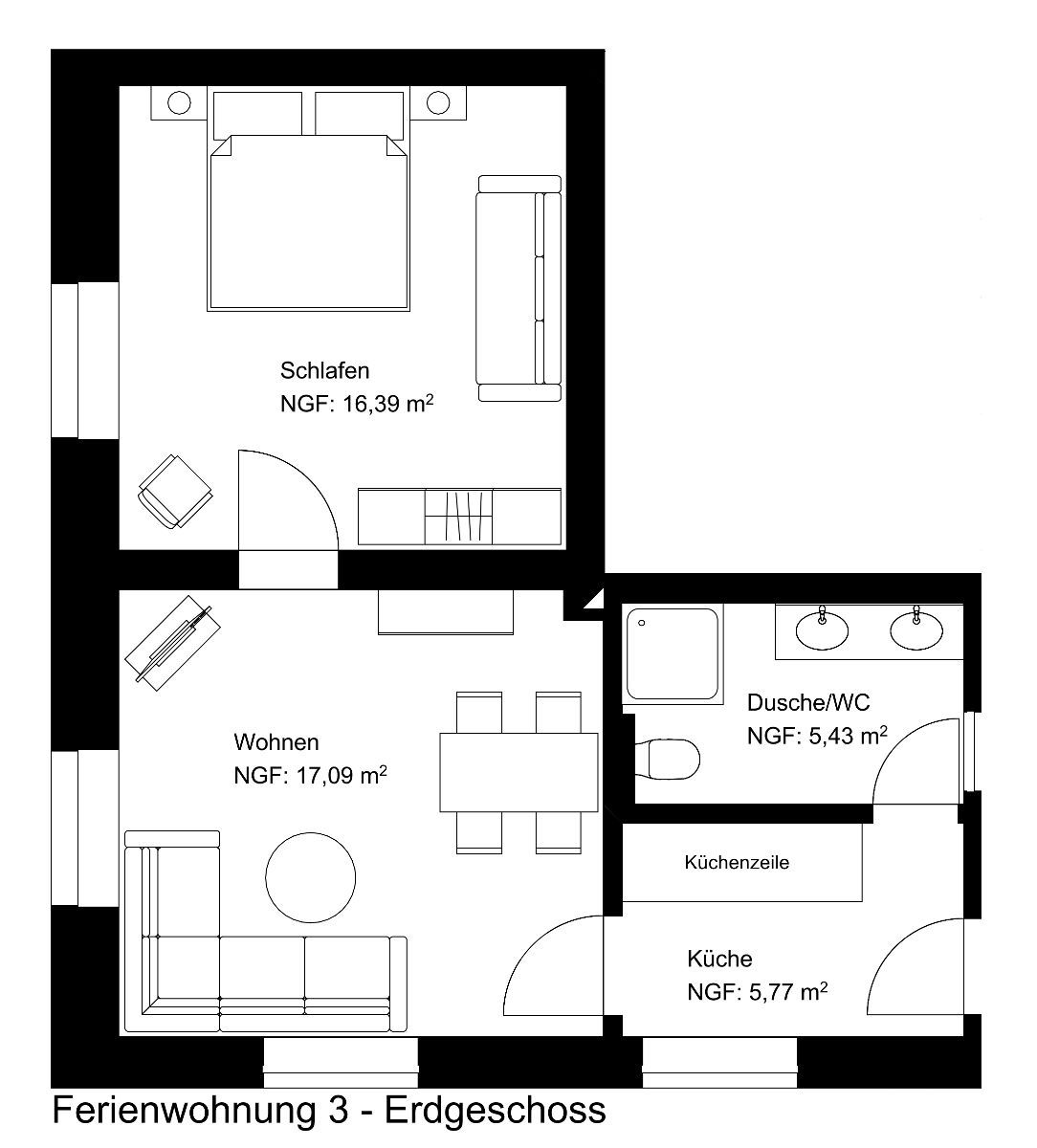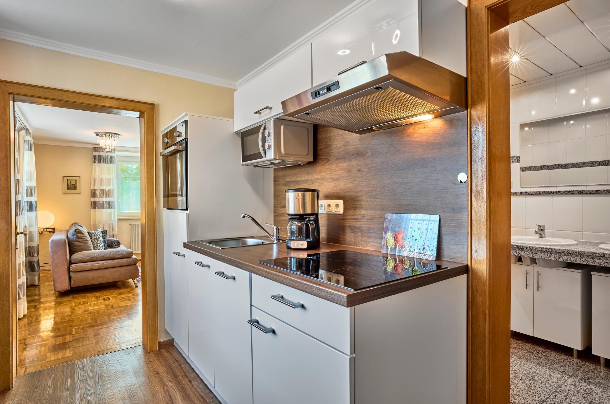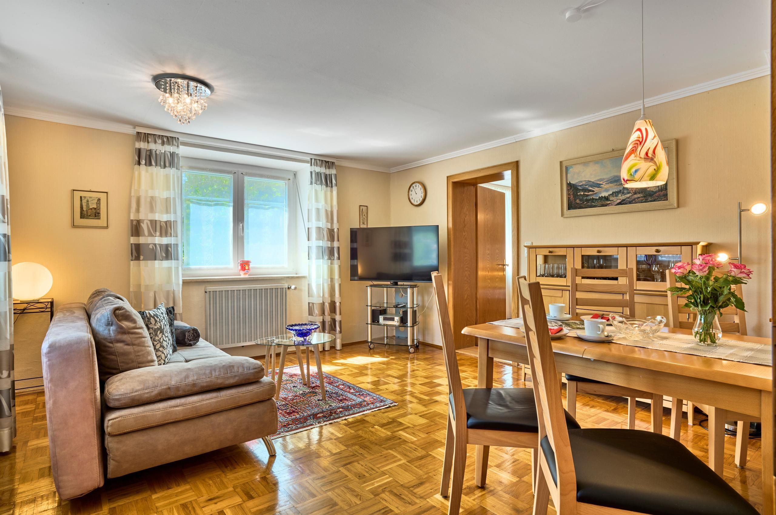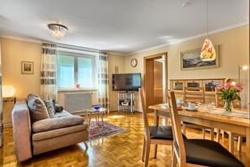 Die 4-Sterne Wohnung befindet sich im Erdgeschoss und hat eine separate Küche mit Geschirrspülmaschine, Wohnraum mit Essecke, Couch, TV, W-Lan usw. Ein Schlafzimmer mit Doppelbett und Schlafcouch und ein Bad mit Dusche, Doppelwaschtisch u. WC.