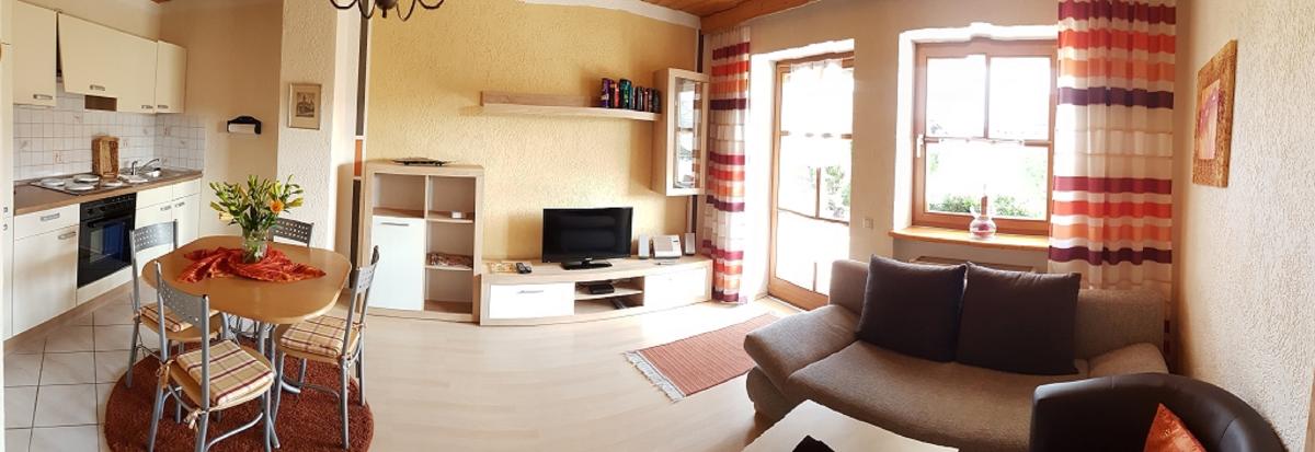Die Ferienwohnung verfügt auf 40qm über einen Wohnbereich mit Küchenzeile, Essecke, Couch und Fernseher, ein Schlafzimmer mit Doppelbett und ein Badezimmer. Das Badezimmer ist mit einer Dusche und WC ausgestattet. Auf der großen Sonnenterrasse können Sie den Ausblick auf den Bayerischen Wald genießen und entspannen.
