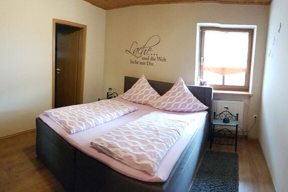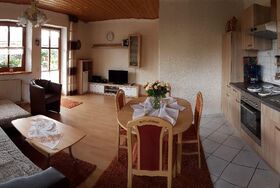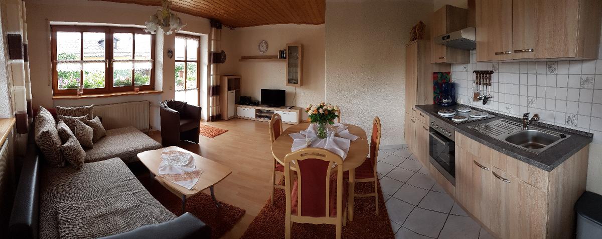 Die Ferienwohnung verfügt auf 50qm über einen Wohn-Schlafbereich mit Küchenzeile, Essecke, Schlafcouch und Fernseher, ein Schlafzimmer mit Doppelbett und ein Badezimmer. Das Badezimmer ist mit einer Dusche und WC ausgestattet. Auf der großen Sonnenterrasse können Sie den Ausblick auf den Bayerischen Wald genießen und entspannen.