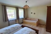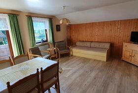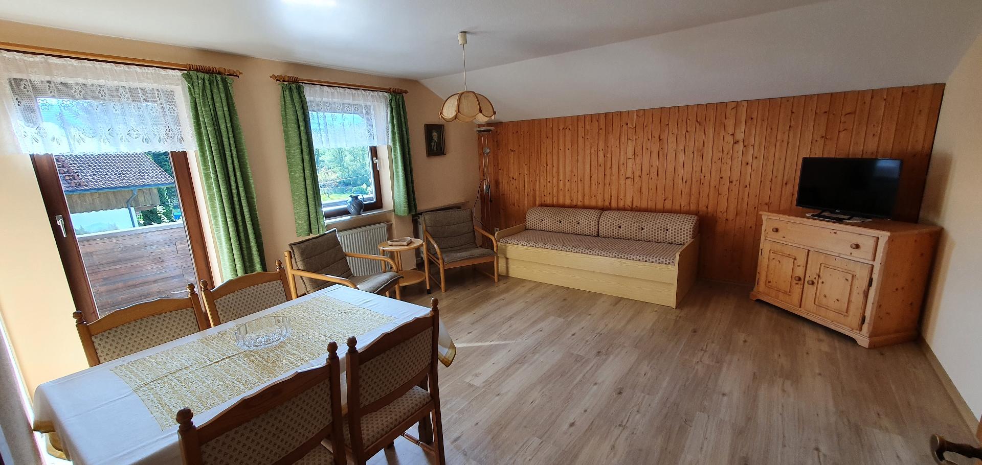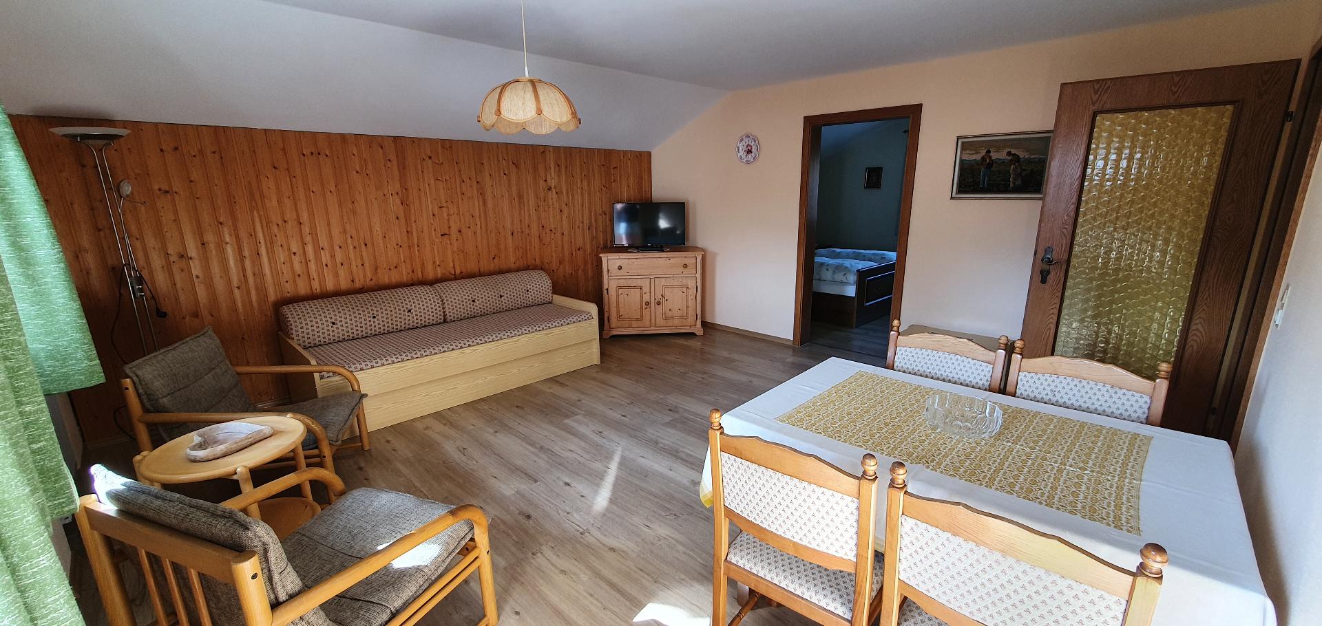 Die Ferienwohnung mit 50qm liegt im ersten Stock und ist für bis zu 4 Personen ausgelegt. Im Wohnzimmer befindet sich ein Essbereich, ein Fernseher und ein Schlafsofa. Im separaten Schlafzimmer befindet sich ein bequemes Doppelbett. Die Küche mit Küchenzeile ist mit einem Kühlschrank und Kaffeemaschine ausgestattet. Ein separates WC ist vorhanden. Die Ferienwohnung verfügt über einen Balkon.