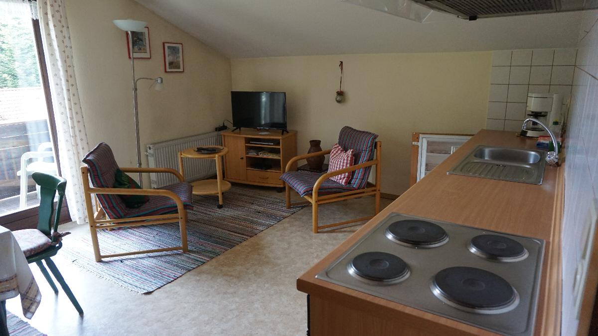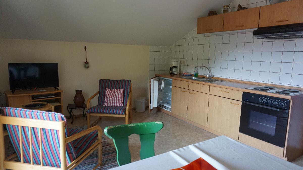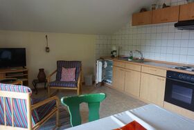 Die Ferienwohnung mit 70qm liegt im zweiten Stock und ist für bis zu 4 Personen ausgelegt. Im Wohn- und Essbereich befindet sich eine Küchenzeile, ein Esstisch mit Stühlen und ein Fernseher. Der Balkon ist über den Wohnbereich erreichbar. Jedes der beiden Schlafzimmer verfügt über ein Doppelbett und Sitzgelegenheiten. Das Badezimmer ist mit Dusche ausgestattet. Das WC ist separat.