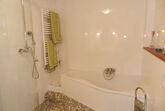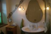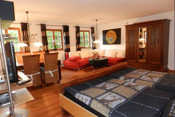 Raum in Hülle und Fülle erwartet Sie in Empore III. Auf 34 qm, die mit einem schimmernden Lärchenholzfußboden bedeckt sind, befindet sich an der inneren Wand das 2 x 2 m große handgefertigte, massive Doppelbett mit Blick auf die Lamaweide. Durch insgesamt 5 Fenster flutet das Licht. Der Unterhaltungs-Tower lässt sich entweder zu den Betten drehen oder zur gemütlichen Eckcouch mit seinem Trommeltisch. Sogar von Tisch mit vier Stühlen aus können Sie die Nachrichten verfolgen. Für Geschäftsreisende dient er als Büro. Der Gast kann ihn auch zum Malen, Lesen, Spielen oder nur zu einer Brotzeit nutzen. Ihr luxuriöses Bad liegt nur einen Sprung über den Gang. Es könnte auch Verwöhnoase mit Bidet, WC, Dusche, Badewanne und Waschtisch genannt werden. Der Auftritt zur Badewanne ist ebenso wie der Duschbereich und der Abschluss der Wandfliesen in Mosaiken gearbeitet. Der Fön liegt auf einem Kästchen neben dem formschönen, sanft geschwungenen Waschtisch, von dem aus Sie auch durch das Fenster ins Grüne blicken können. In der Gemeinschaftsküche können Sie Ihr Essen zubereiten. Sie können sich auch nach Wunsch von unserem paradiesischen Frühstück verwöhnen lassen.