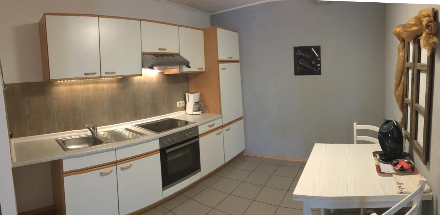 Die Küche hat eine funktionelle Küchenzeile, mit Herd, Backofen, und Kühlschrank, Kaffemaschine, Wasser- und Eierkocher. Selbstverständlich gehören auch Töpfe, Pfannen und alles andere zum Kochen dazu. Besteck, Gläser, Tassen und Teller sind in ausreichender Anzahl vorhanden, ebenso Geschirrtücher.