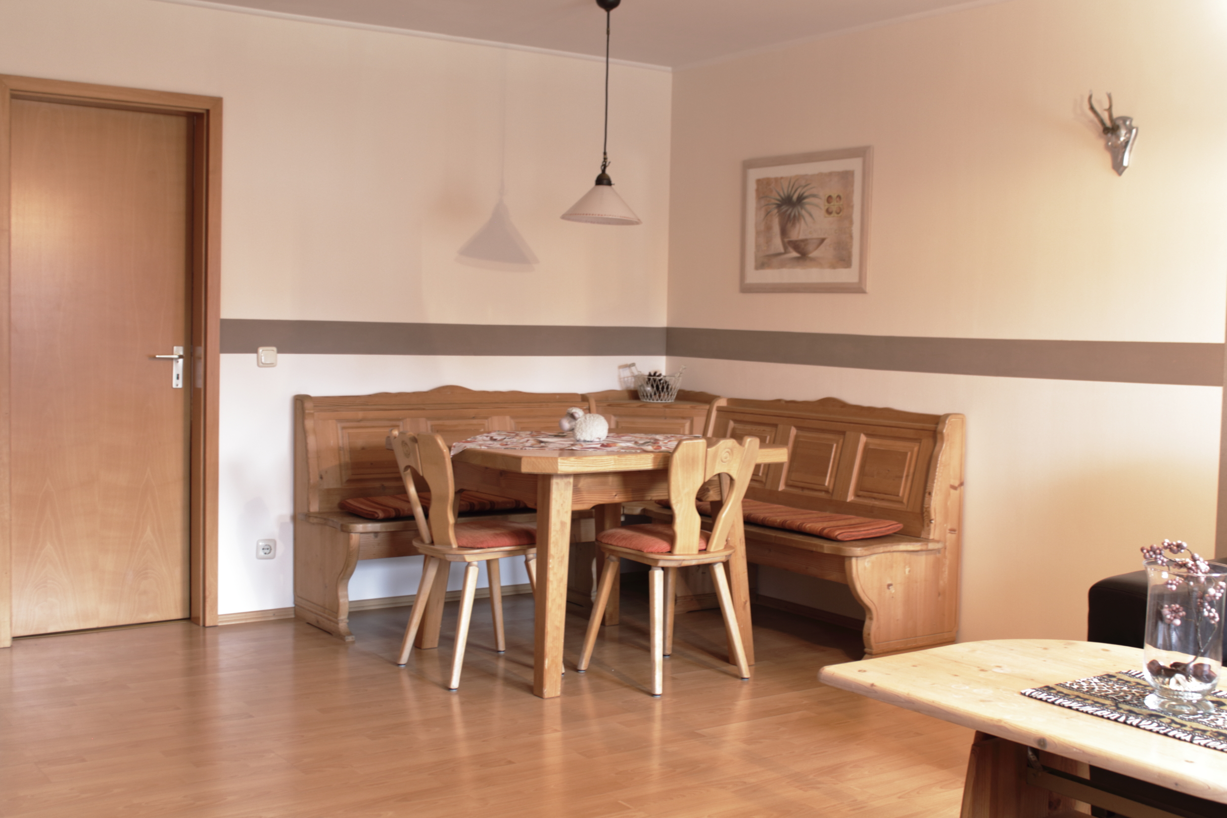Auch befindet sich hier ein großer Esstisch mit Eckbank und 2 Stühlen.