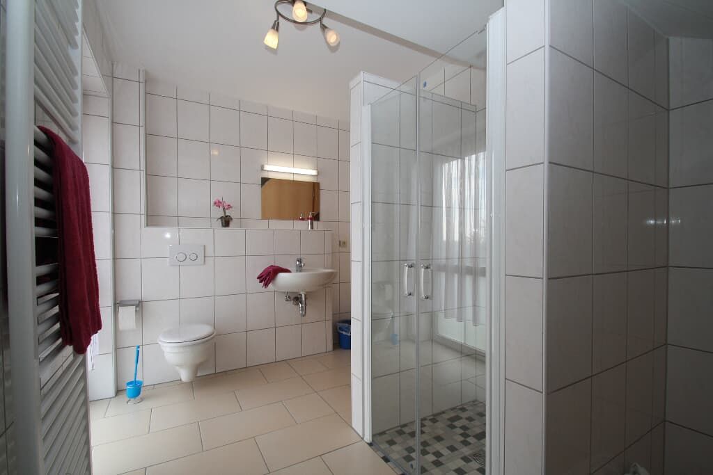 Im großzügigen Badezimmer befinden sich Dusche/WC/Waschbecken.