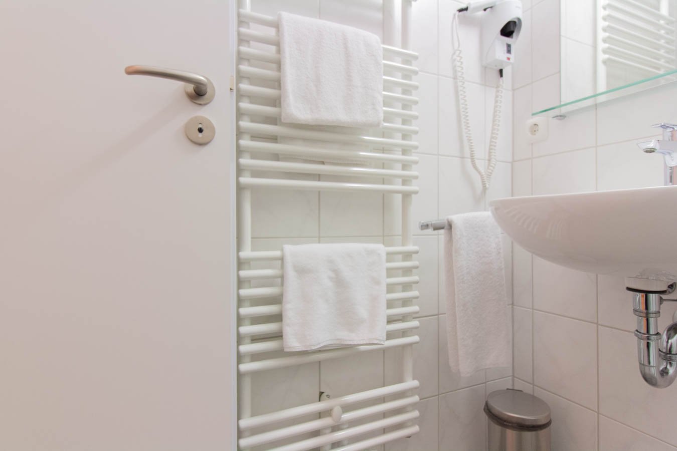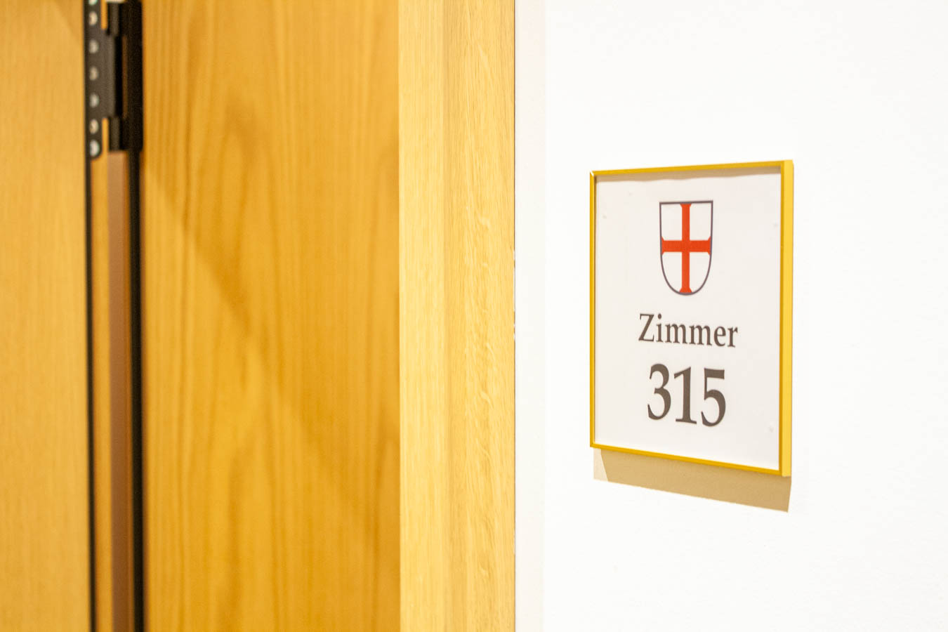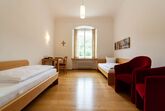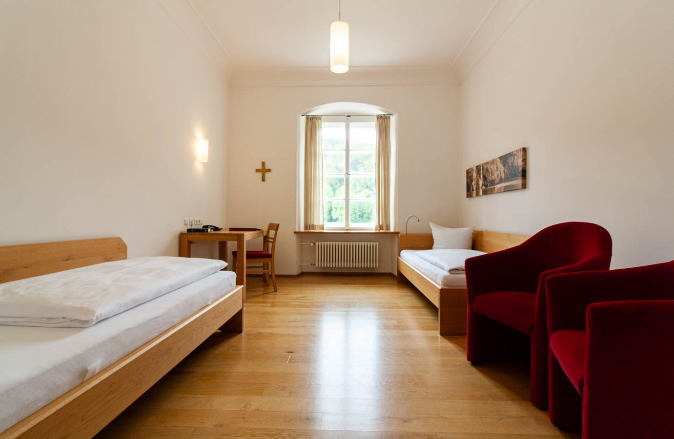 Mit der schlichten, soliden Ausstattung (Bett 90x200 cm, Schrank, Schreibtisch) in modernem Design, passen sich unsere Zweibettzimmer im Georgstrakt an die klösterliche Umgebung an. Auf persönlichen Komfort (Dusche, Toilette, Haartrockner, Handtuchheizkörper) und moderne Technik (Wifi, Direktwahltelefon) müssen Sie dennoch nicht verzichten.