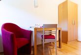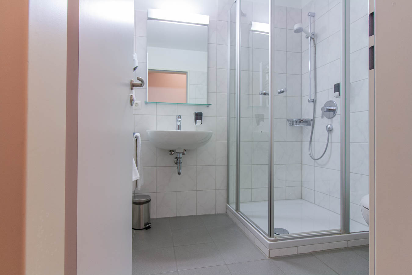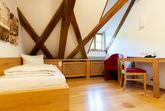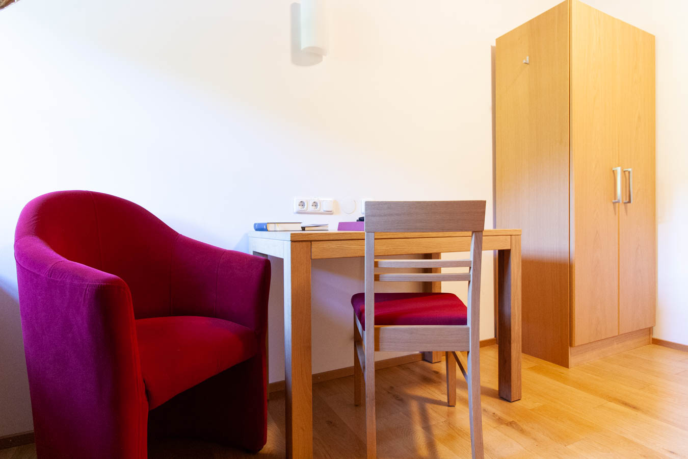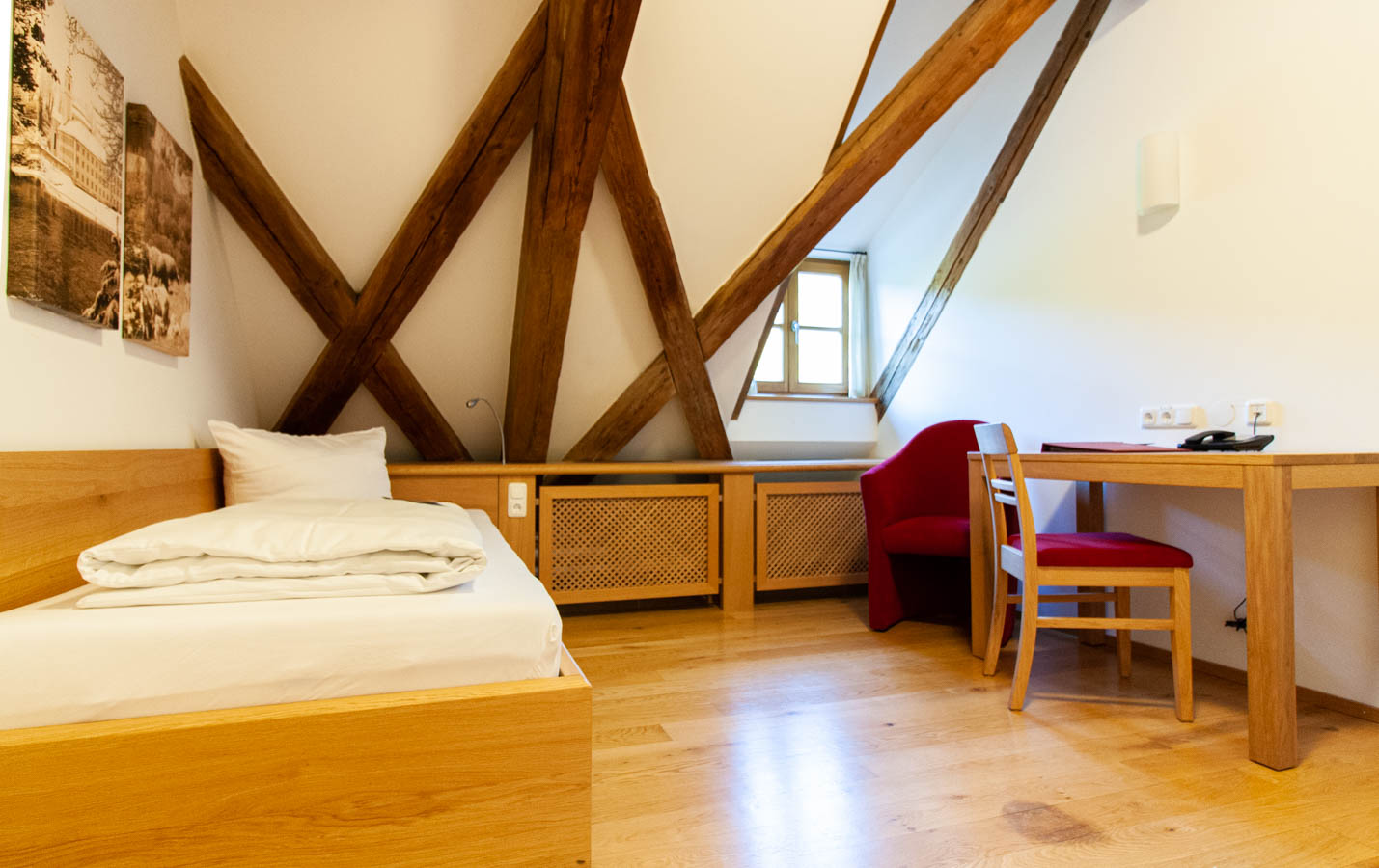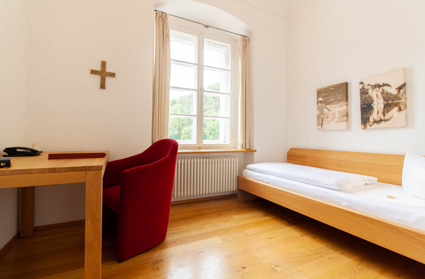 Mit der schlichten, soliden Ausstattung (Bett 90x200 cm, Schrank, Schreibtisch) in modernem Design, passen sich unsere Einzelzimmer im Georgstrakt an die klösterliche Umgebung an. Auf persönlichen Komfort (Dusche, Toilette, Haartrockner, Handtuchheizkörper) und moderne Technik (WiFi, Direktwahltelefon) müssen Sie dennoch nicht verzichten.