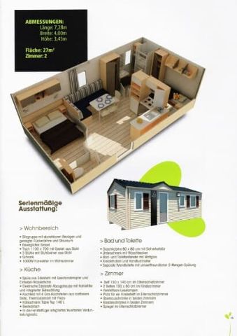 Das behagliche, modern eingerichtete Mobilheim Rapunzel ist 27qm groß und bietet Platz für 4 Personen. Im ersten Schlafzimmer befindet sich ein Doppelbett. Im zweiten Schlafzimmer befinden sich zwei Einzelbetten. Das Bad besteht aus Dusche und WC. Im Wohnzimmer befindet sich eine Essecke und ein Fernseher. Küchenzeile mit Mikrowelle, Kaffeemaschine, Kühlschrank, Herd, Geschirr und Essecke lässt keine Wünsche offen. Auf der schönen Terrasse können Sie die Sonne genießen. Parkplatz auf dem Grundstück und WLAN vorhanden. KEINE HUNDE ERLAUBT!
