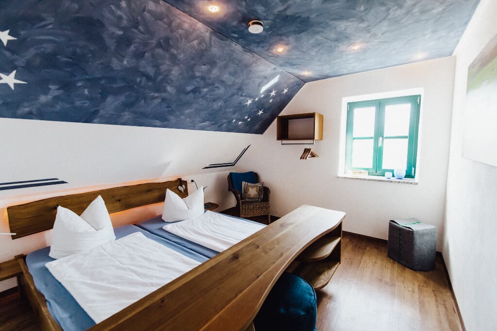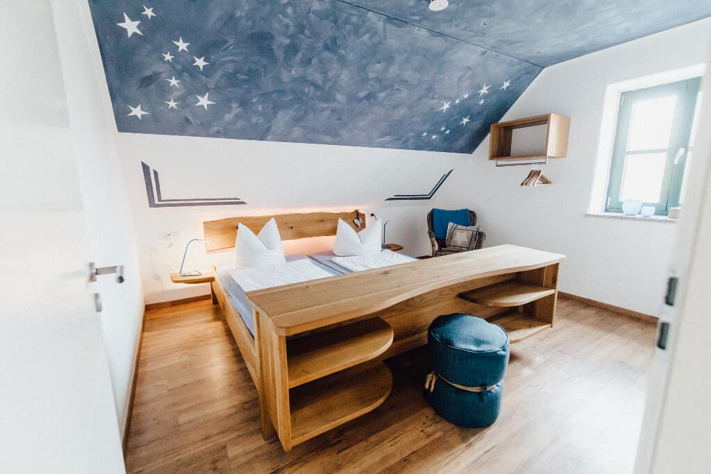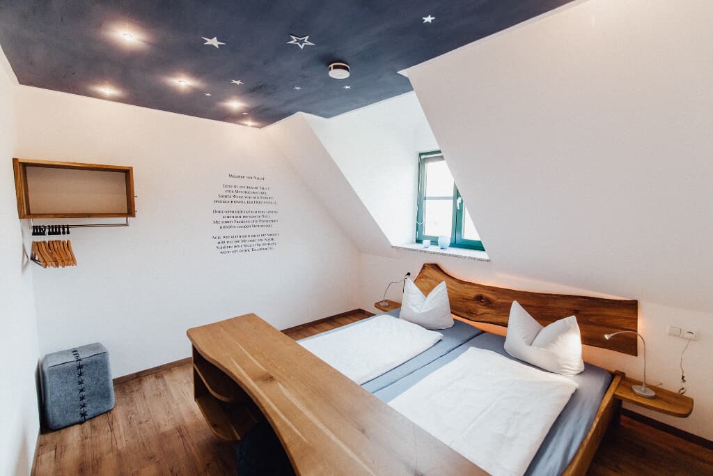 Die Ferienwohnung Sternenhimmel mit 105 qm Wohnfläche bietet Platz für 9 Personen. Das gemütliche Wohnzimmer mit Schlafsofa und Flachbild-TV lädt zum Verweilen ein. Die komplett ausgestattete Küche mit Geschirrspüler, Kühlschrank, Gefrierschrank, Herd, Backofen, Mikrowelle, Wasserkocher, Eierkocher, Toaster, und Senseo-Pad-Maschine lässt keine Wünsche offen. Durch den direkten Zugang zum Balkon, können Sie das Frühstück und das Abendessen direkt dort geniessen. Die Ferienwohnung verfügt über 2 Schlafzimmer mit einem großen Doppelbett (200 x 200 cm). Die 2 geräumigen Bäder mit ebenerdiger Dusche, großem Spiegel und großzügigem Regal für Ihre Utensilien, runden das Gesamtbild ab. Zusätzlich 40 qm Lebensraum auf der Galerie mit weiteren 5 Betten. Zum Reinigen Ihrer Kleidung stehen eine Waschmaschine und Trockner im Haus zur Verfügung. Die Sauna mit Ruheraum im Untergeschoß dürfen Sie gerne nutzen. Vor allem im Sommer können Sie entspannte Grillabende in unserem Garten verbringen.