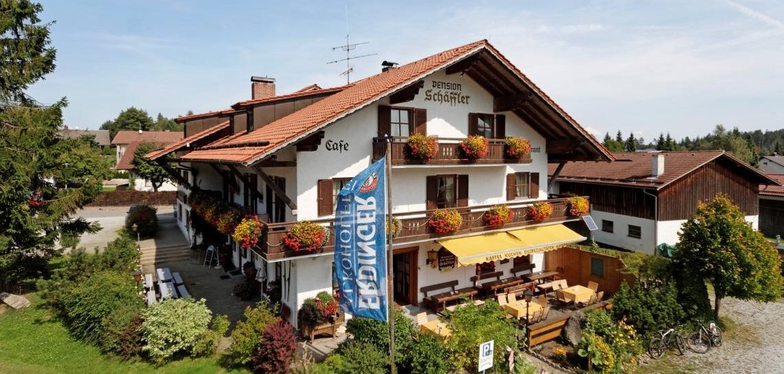 Rustikal, eingerichtetes Cafe/Restaurant mit Bayerischer Küche. Gemütliche Gästezimmer mit Dusche/WC, Sat-TV und Balkon. Sonnenterrasse, Liegewiese, Sauna, Solarium, Fitnessraum, Ski- und Fahrradkeller. Wanderwege, Loipen, Skilifte, Rodelbahn und Bike-Park am 500 m entfernten Geißkopf. Preis Ü/F 30,-- bis € 38,--, HP-Zuschlag € 20,--