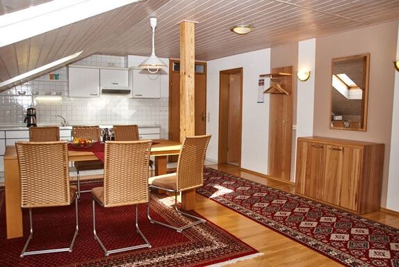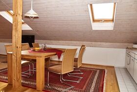 Die großzügige Ferienwohnung mit 100qm verfügt über eine Küchenzeile mit Essplatz, Coach-Ecke mit Fernseher, Badezimmer mit Dusche/WC sowie ein separates WC und drei Schlafzimmer (2 Doppelzimmer / 1 Einzelzimmer / 1 Babybett) Auf der Dachterrasse steht ein zweiter Kühlschrank für Sie bereit.