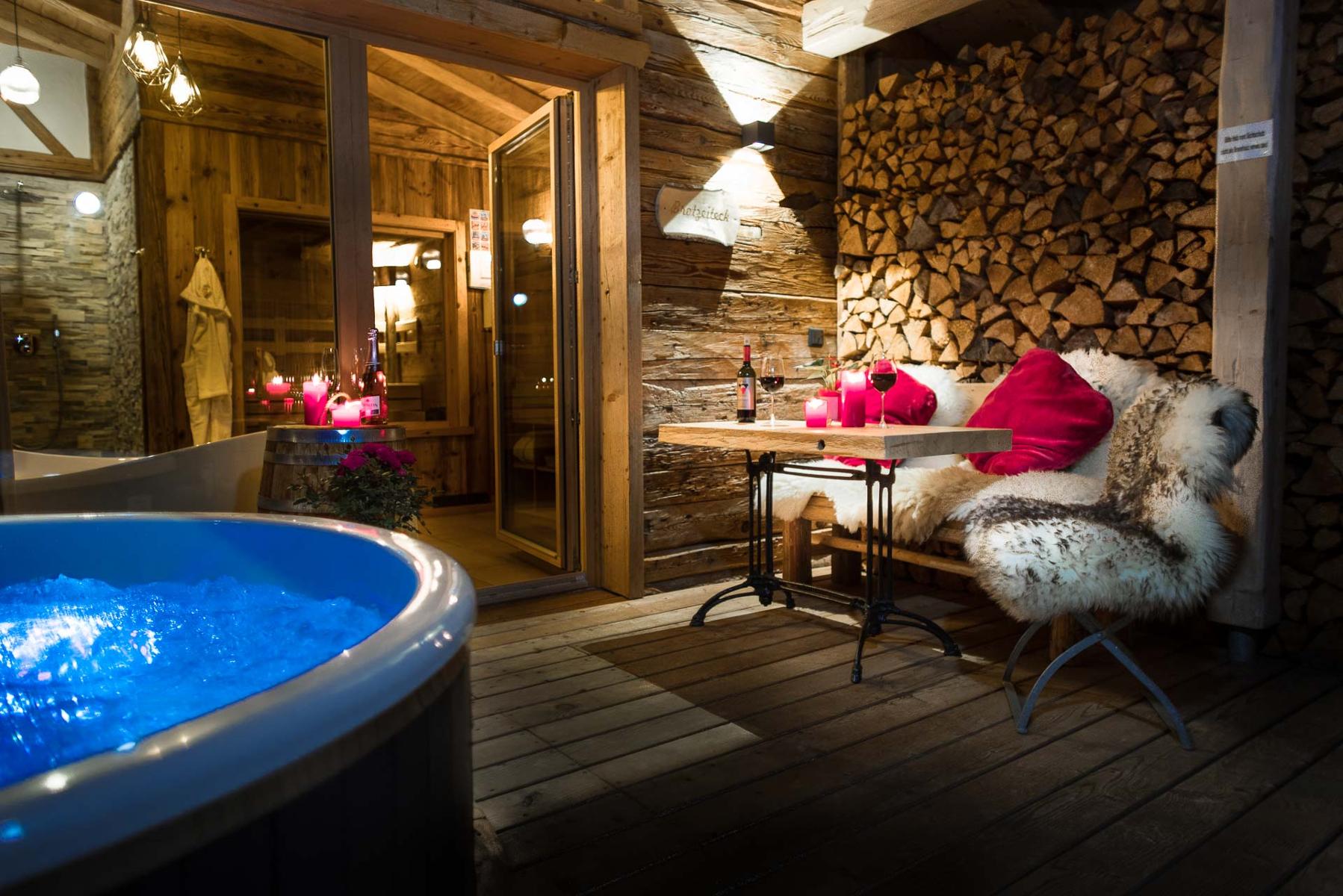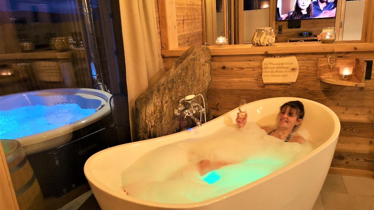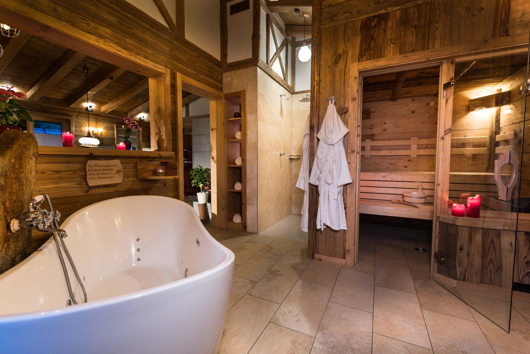 Ein Highlight in ihrer eigenen kleinen Hütte ist ihr eigener Wellnessbereich mit einer urigen Finnischen Sauna aus Altholz, einer großzügigen Standbadewanne mit LED und Massagedüsen sowie einer großen ebenerdigen Regendusche mit Schwallbrause.