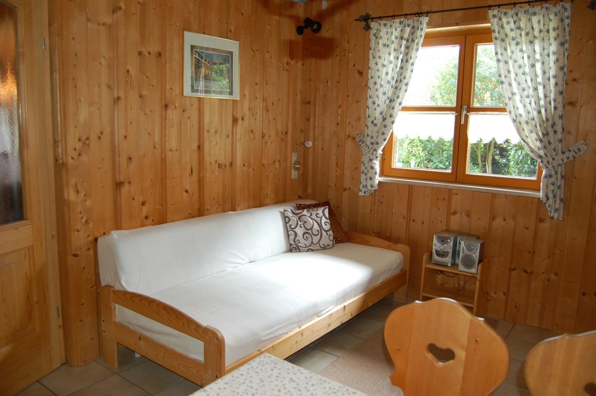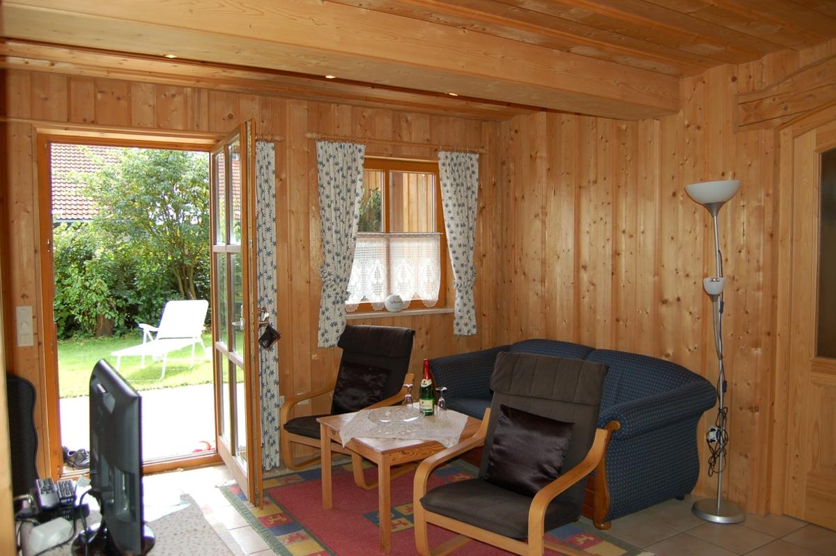 Wohnung mit ca. 40 m2 im Erdgeschoß mit separatem Zugang vom Garten aus: Wohnschlafzimmer mit 4 Betten, Couch und 2 Sessel, SAT-TV und Radio, Wohnküche, Bad mit WC u. Dusche, Terrasse und Liegewiese.
