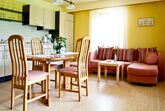 Die Wohnküche: Mit komplettem Küchenblock, Kaffeemaschine, Toaster, Eierkocher und allem notwendigem für ein angenehmes Frühstück. Mit Schlafcouch (für weitere zwei Schlafgelegenheiten).