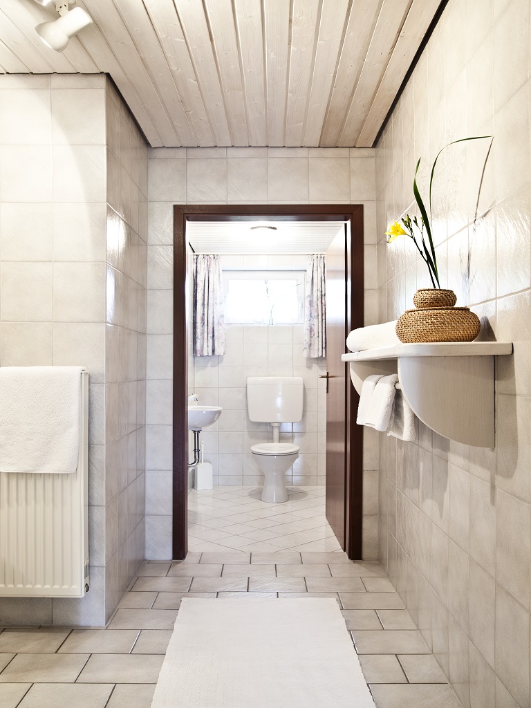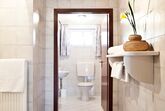 Das Badezimmer: Waschbecken, Spiegel, Dusche und natürlich frische Handtücher.