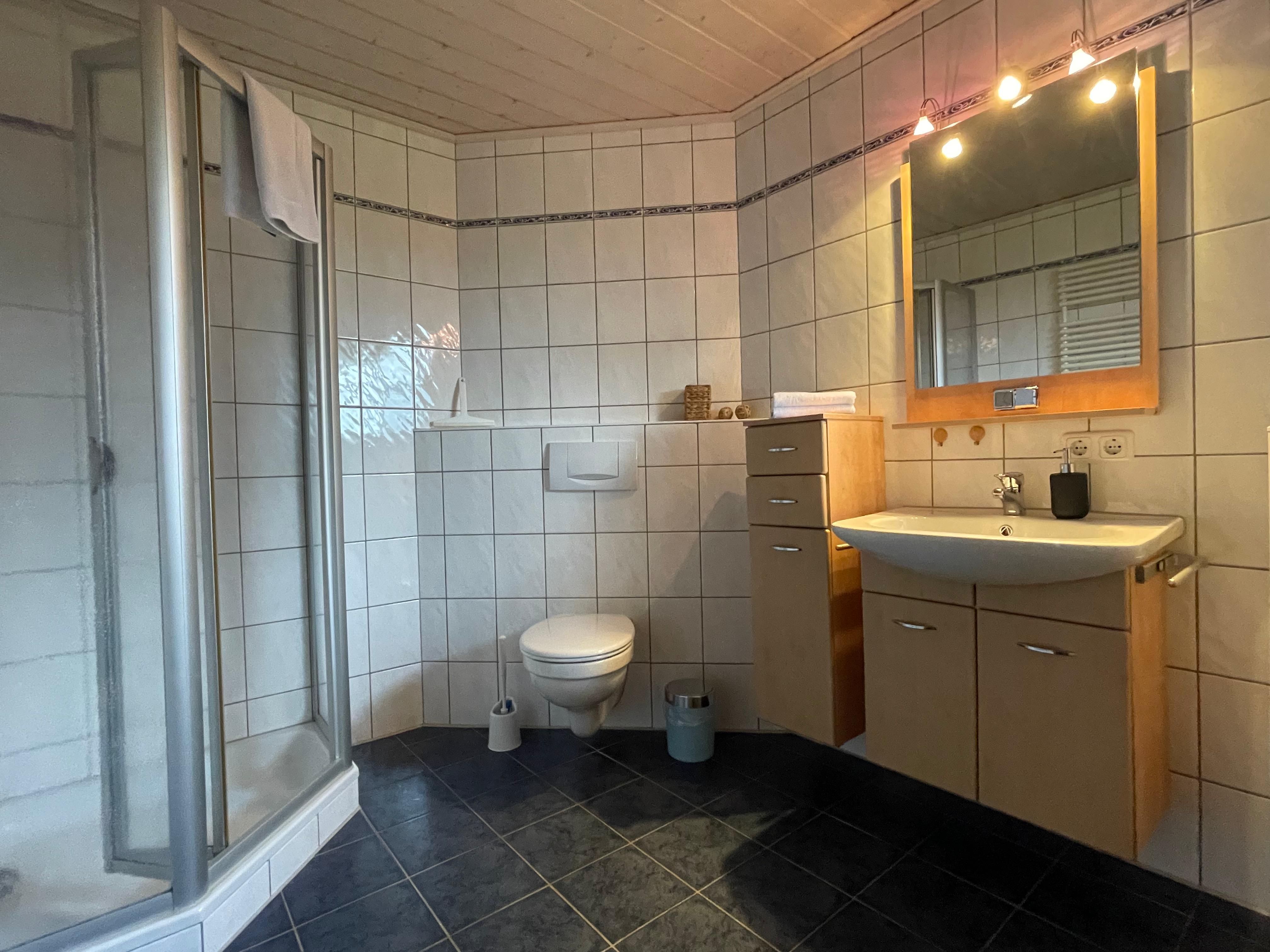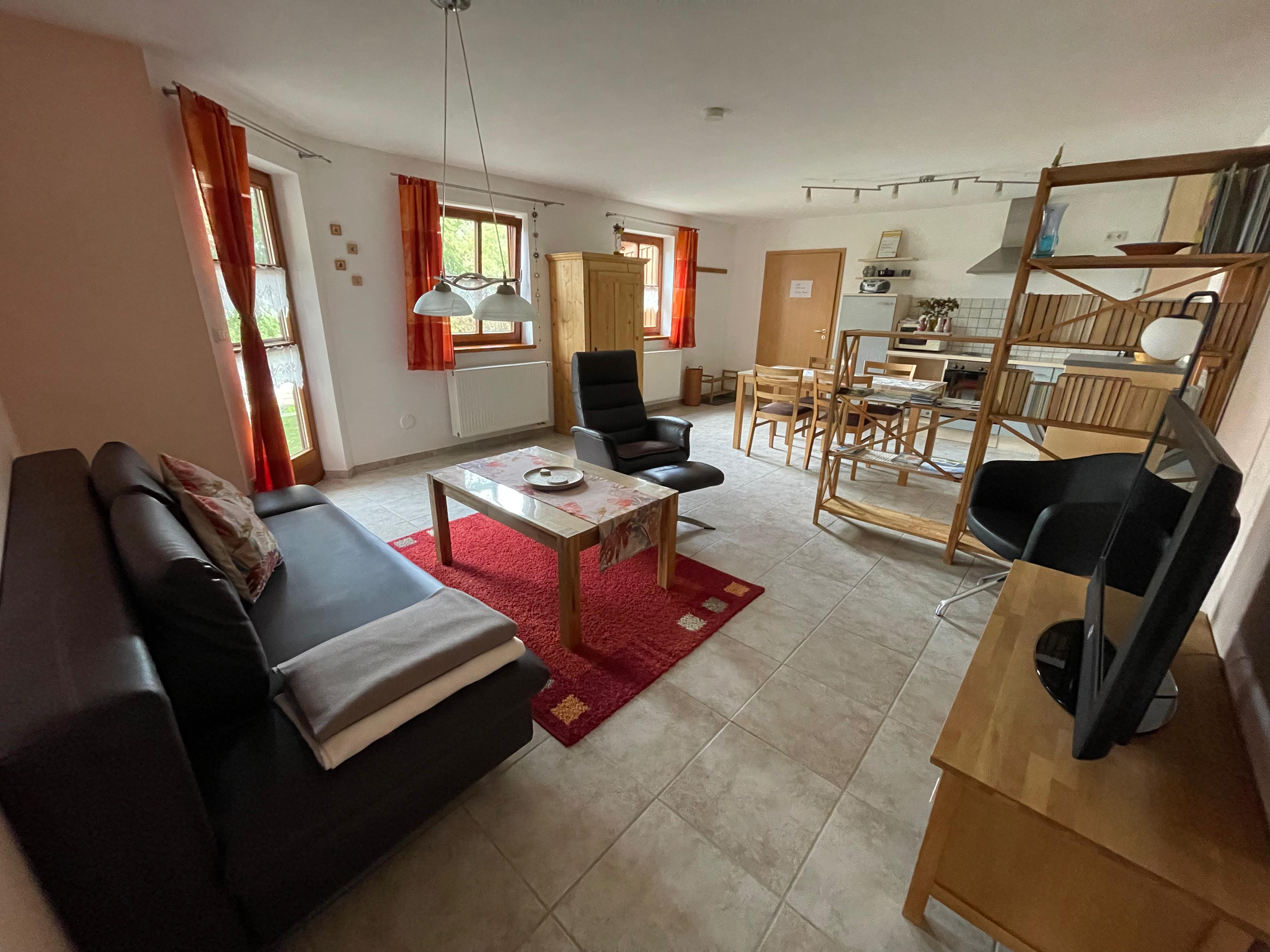 Sie verfügt über ein großes Wohn- und Esszimmer mit Couch und Küche. 1 Doppelzimmer (Kinderbett vorhanden). Bad/WC. Überdachte Terrasse mit Gartenmöbeln. Sat-TV, CD-Radio, Grill, Bettwäsche und Handtücher. Nichtraucherwohnung. Zudem ist eine E-Bike-Garage sowie eine Ladestation für Fahrräder vorhanden.
