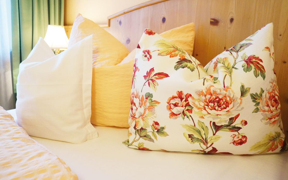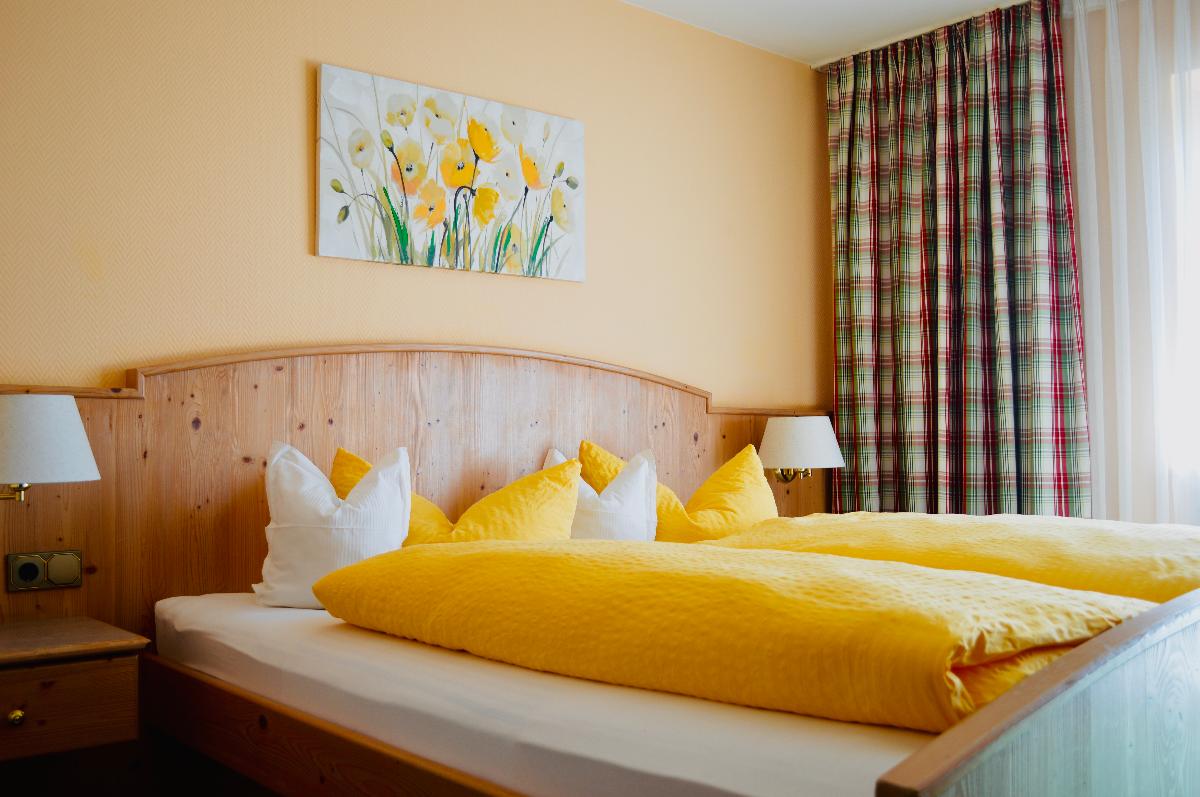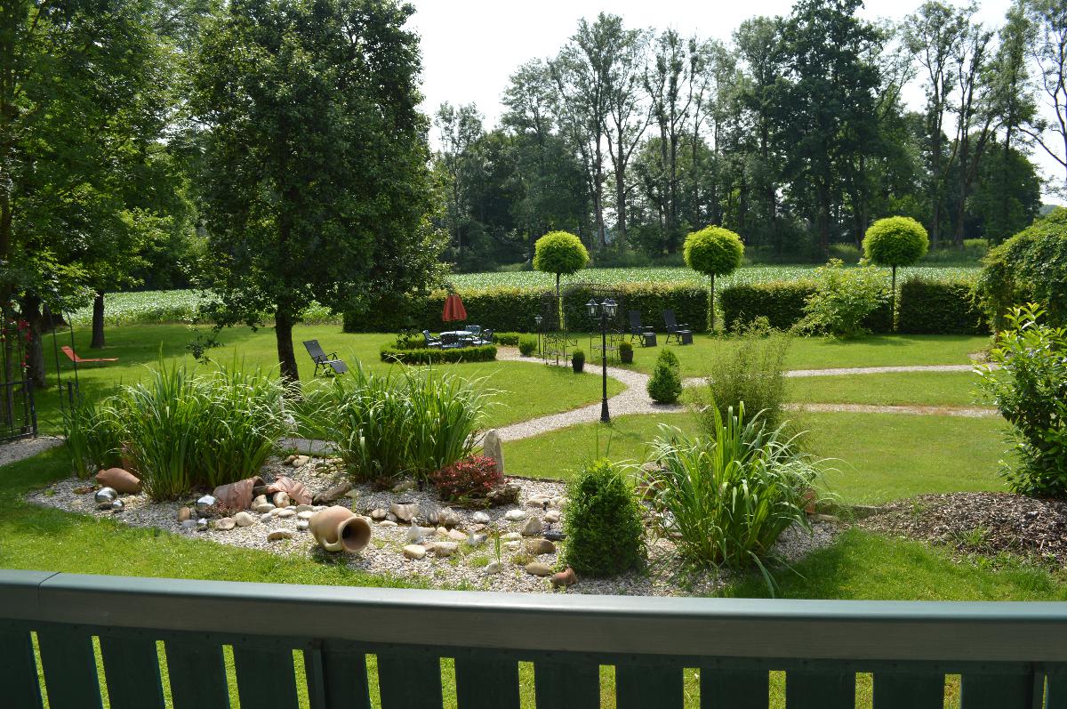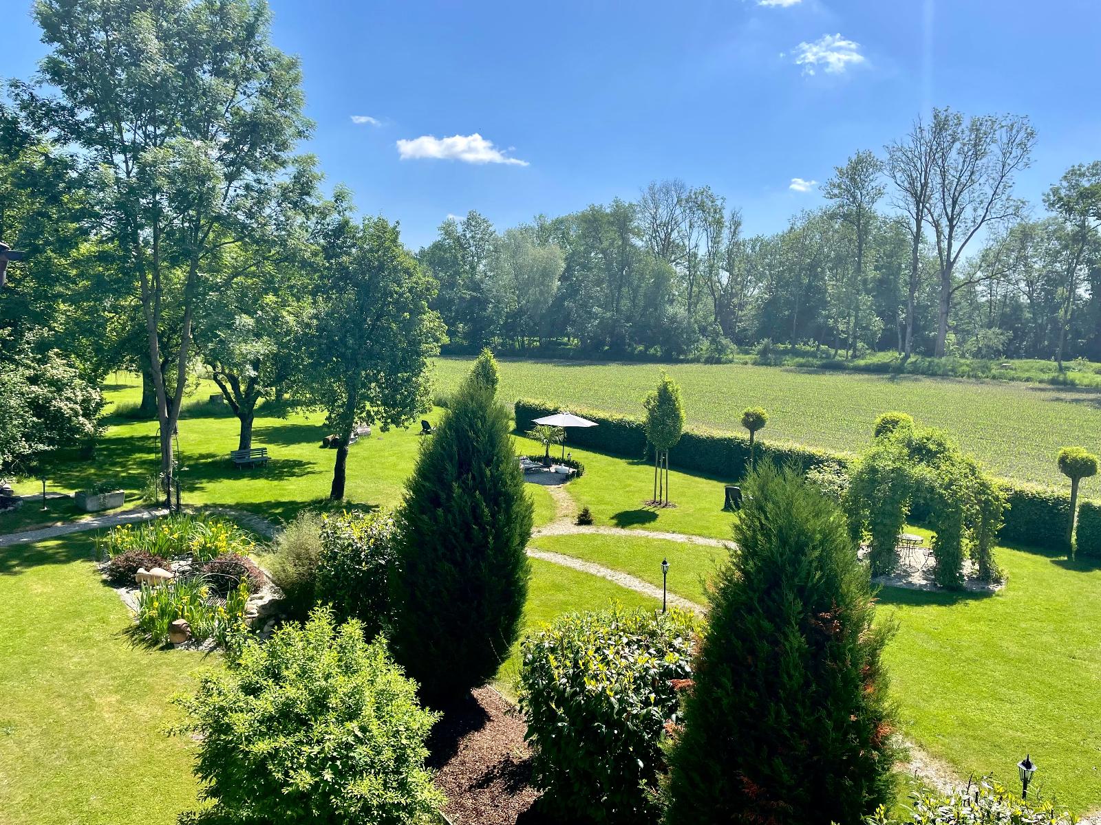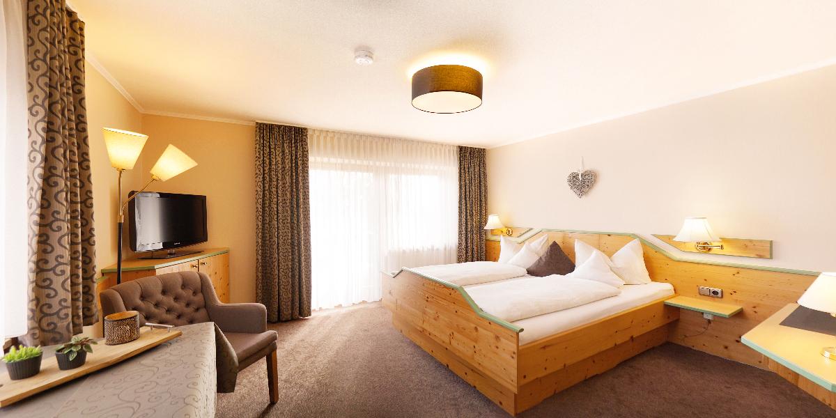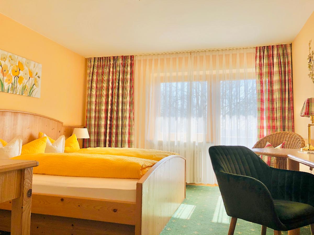Gemütliches, hell möbliertes Komfort-Doppelzimmer auf der Südseite mit großem Balkon, Blick auf unsere großzügige Gartenanlage mit angrenzenden Wiesen und Feldern. Betten in Komfort-Höhe.