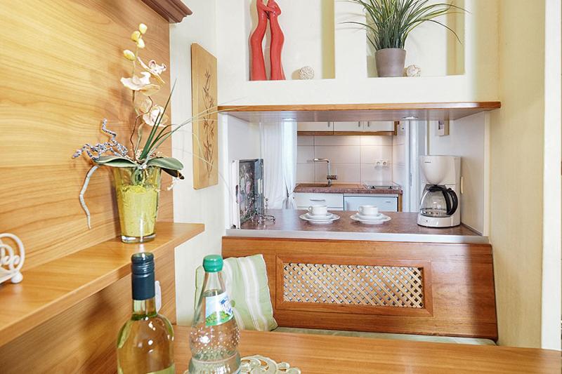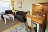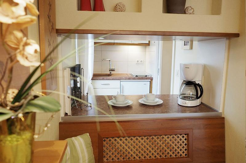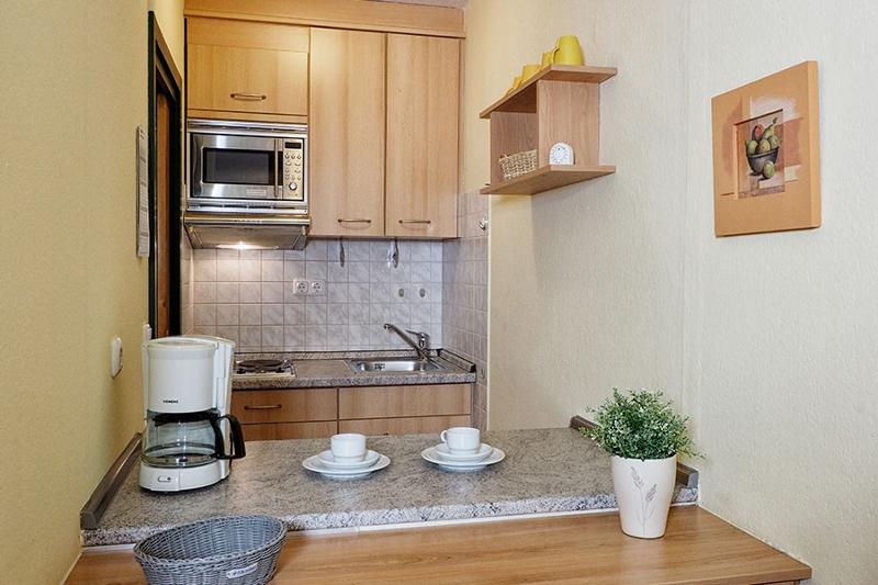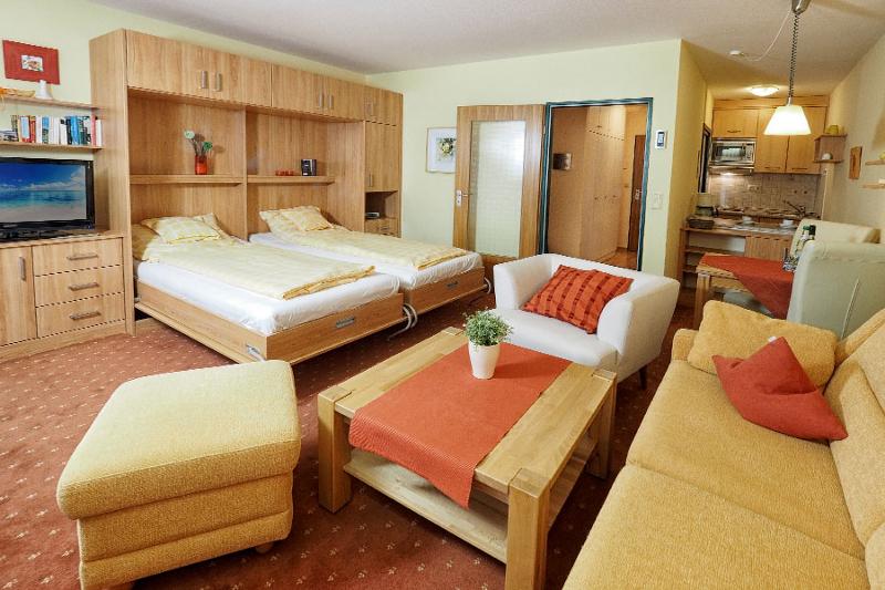 Das komfortable und komplett eingerichtete Appartement ist bei einer Größe von 35-41qm für 2 Personen geeignet. Es besteht aus einem kombinierten Wohn- und Schlafraum mit Küche bzw. Kochnische. Die vollausgestattete Kochnische verfügt über einen Kühlschrank mit