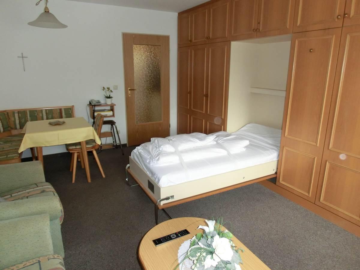 Mit praktischen Schrankbetten haben Sie tagsüber einen gemütlichen Wohnbereich, der sich abends mit einem kurzen Handgriff in ein schönes Schlafzimmer verwandelt. (Teilweise sind die Appartements mit praktischen Schrankbetten ausgestattet, teilweise mit freistehenden Betten) Im Wohnbereich ist außerdem eine komfortable Essecke, eine bequeme Couch mit kleinem Tisch, ein Fernseher und eine kleine Einbauküche mit Herd, Wasserkocher und Kaffeemaschine. Das neue Bad ist mit Dusche und WC ausgestattet. Außerdem dürfen Sie gerne den überdachten Südbalkon des Appartements nutzen.