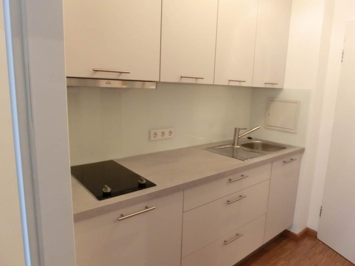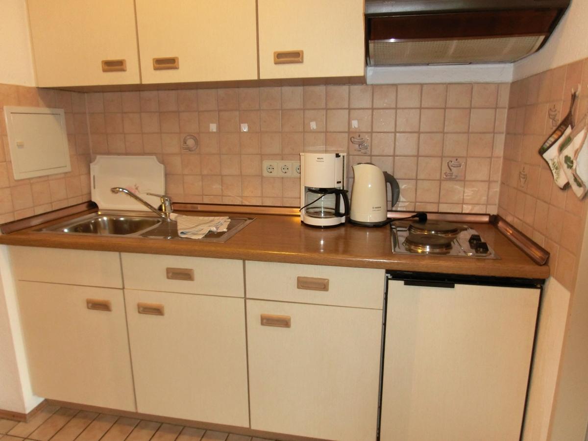 Kleinküche, Kühlschr., 2 Kochpl., Kaffeemasch., Geschirr;