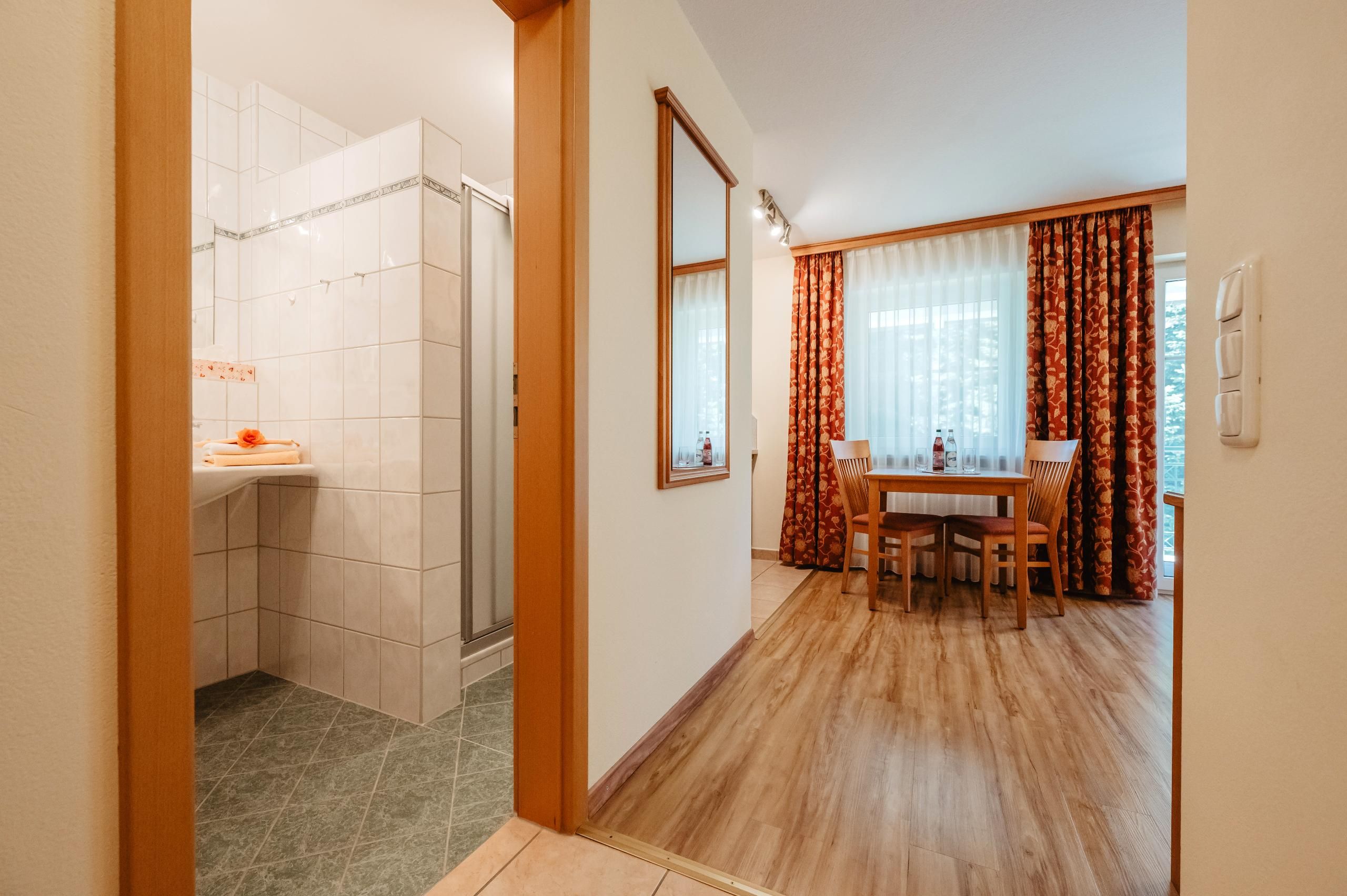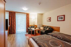 Kuren u. Erholen in komf. 1-2 Zimmer- App. mit Balkon, Du/WC getrennt, Familienbetrieb, Nichtraucherhaus, sehr ruhige Lage - mitten im Grünen am Ende einer kurzen Sackgasse, jedoch direkt im Ort, Geschäfte und Massagepraxen sind nur 120 m, eine Bushaltestelle 50 m entfernt.