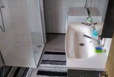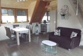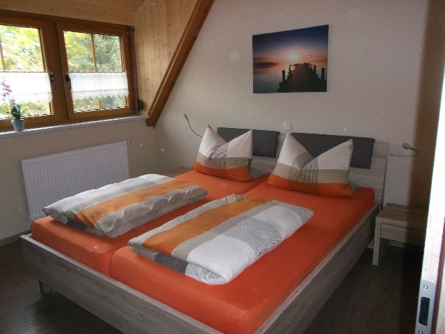 Die FeWo ist in Wohnraum mit Küche, Schlafzimmer und Bad gegliedert. - Im Wohnraum mit Doppelschlafcouch und Eßtisch mit 6 Stühlen befindet sich das Sat-TV-Gerät und ein Radio. - Die moderne Küche ist mit einem Elektroherd mit Ceranfeld (4 Kochstellen), Dunstabzugshaube, Backofen, Kühlschrank, Gefrierbox, Spülmaschine, Wasserkocher und Kaffeemaschine ausgestattet. - Im Schlafzimmer mit Doppelbett finden Sie auch eine Kofferablage. - Zusätzliche Schlafmöglichkeiten mit 2 Betten und Platz für ein Matratzenlager können Sie in der Dachspitze nutzen. - Einen Doppelwaschtisch, Waschmaschine, Glasduschkabine, WC und Haarfön finden Sie im Bad mit Fenster zum Garten. Der kleine Balkon (Frühsonne) ist sehr beliebt.