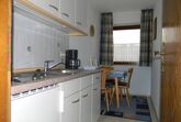Küche vollständig eingerichtet mit Kaffeemaschine, 2-Platten-Herd, Wasserkocher, Mini-Backofen, Toaster