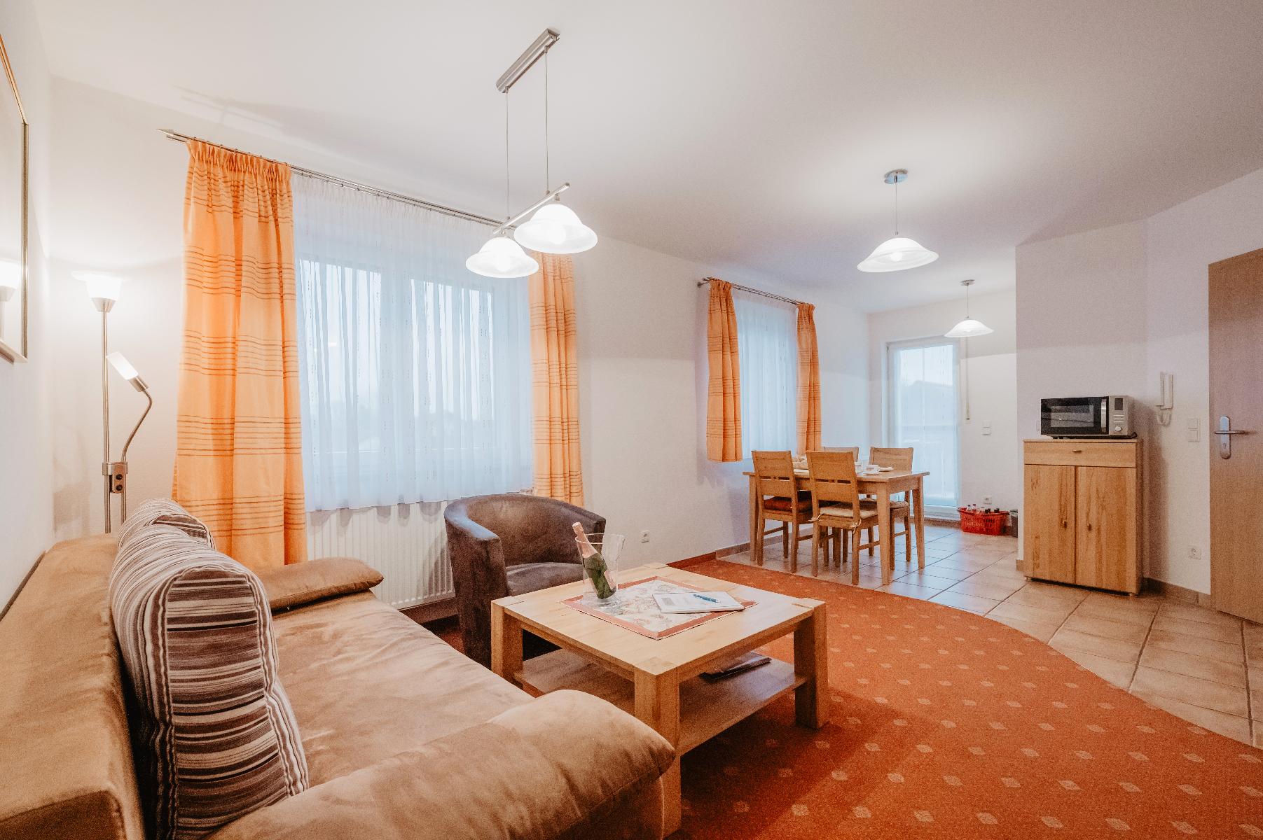 Besteck und Küchenwäsche) ausgestattet. Für die dritte oder vierte Person wird die Couch in den Wohnraum zum Bett umfunktioniert. Das Badezimmer ist mit einer Dusche, WC und Fön ausgestattet. Handtücher und Bettwäsche sind im Preis inklusive. Die Wohnung ist familienfreundlich