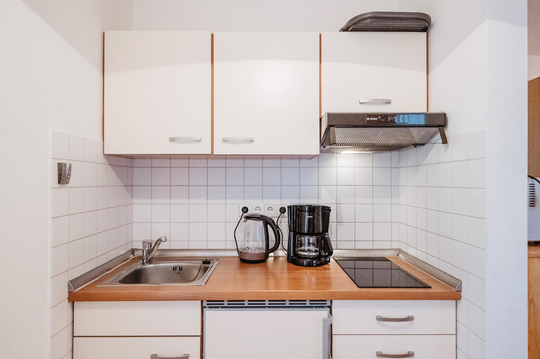 ist mit einer Essecke, einer komplett eingerichteten Küche (Zweiplattenherd, Wasserkocher, Kaffeemaschine, Toaster, Geschirr,