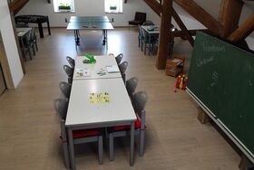 Ein im Dachgeschoss eingerichteter Freizeitraum mit Kicker, Leseecke, Tischtennisplatte und vielen weiteren Beschäftigungsmöglichkeiten für groß und klein.