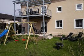 Eine Schaukel mit Rutsche, ein Trampolin mit Netz, sowie ein Grill und Sitzgelegenheiten sowie Liegestühle im Garten sind für beide Ferienwohnungen benutzbar.