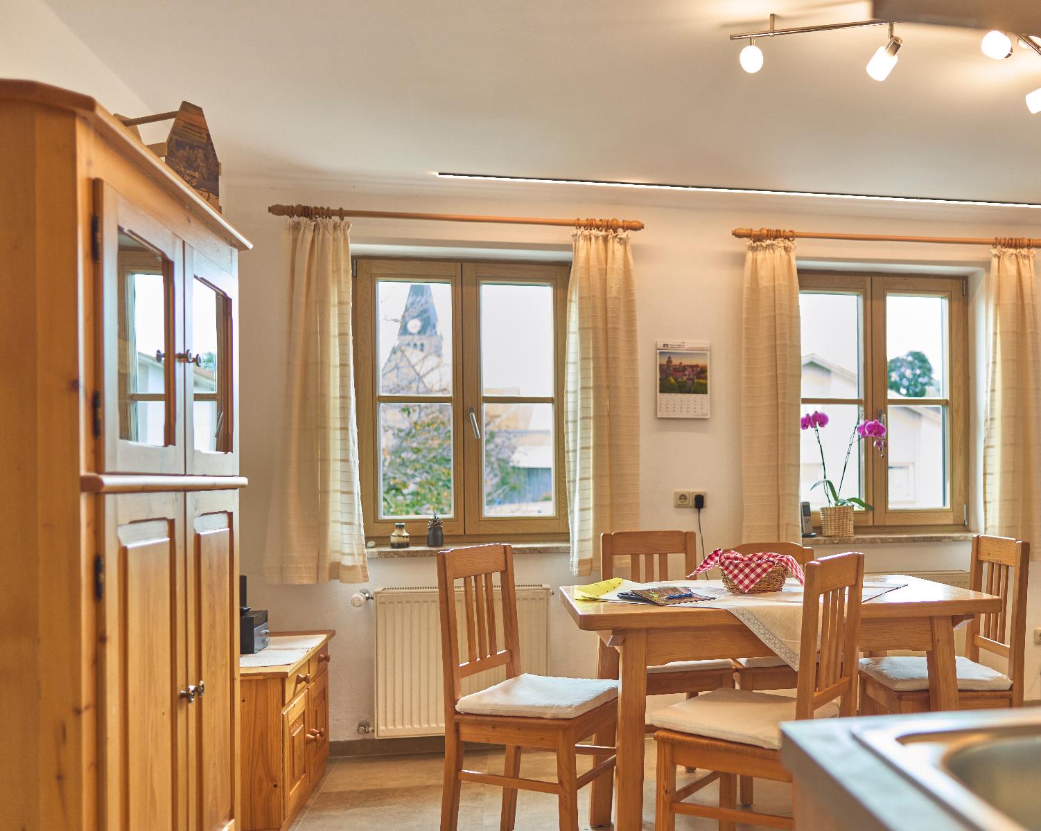 Unser Haus ist zentral und doch ruhig gelegen. Es sind nur wenige Meter bis zur Ortsmitte mit allen wichtigen Einkaufsmöglichkeiten. (Bäcker, Metzger, Postannahmestelle, Gasthäuser).
