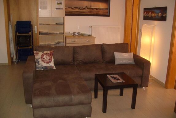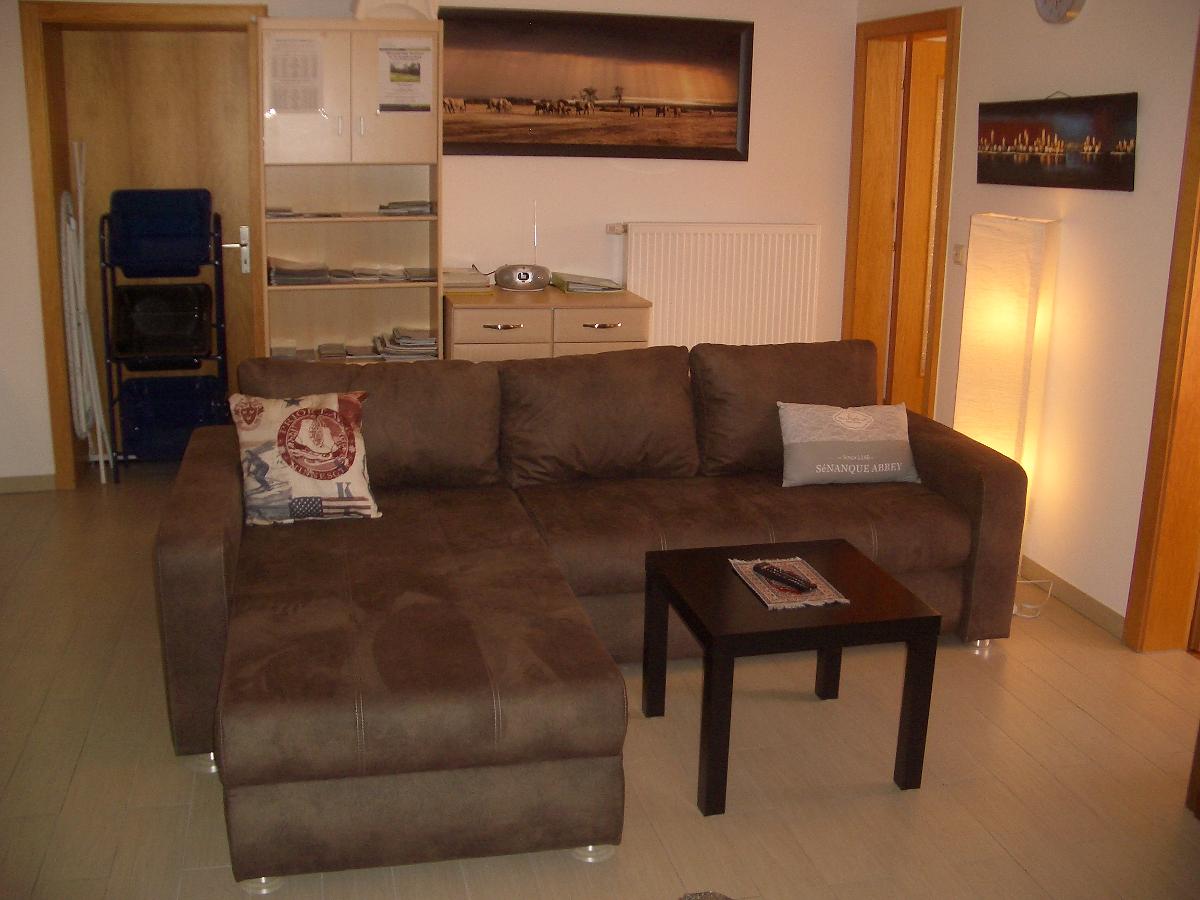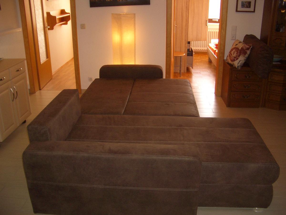 Eine gemütliche neue Eck-auszieh-Couch mit Kuschelkissen, mit einer Liegefläche von mindestens 2,10m x 1,20m bis 160m, Eckschrank aus dem Würfelprogramm, mit einem 42 Zoll (1,02 m) LG-LED-HD-TV, Blue Ray-DVD-mp3-Player, VHS-Videorecorder, Stereoanlage, kostenloser WLAN Zugang, Mikrofaser-Kuscheldecken, viele Spiele, transportables CD-Radio, Papier-Stehlampe, LED-Stehlampe, viele Prospekte uvm.