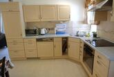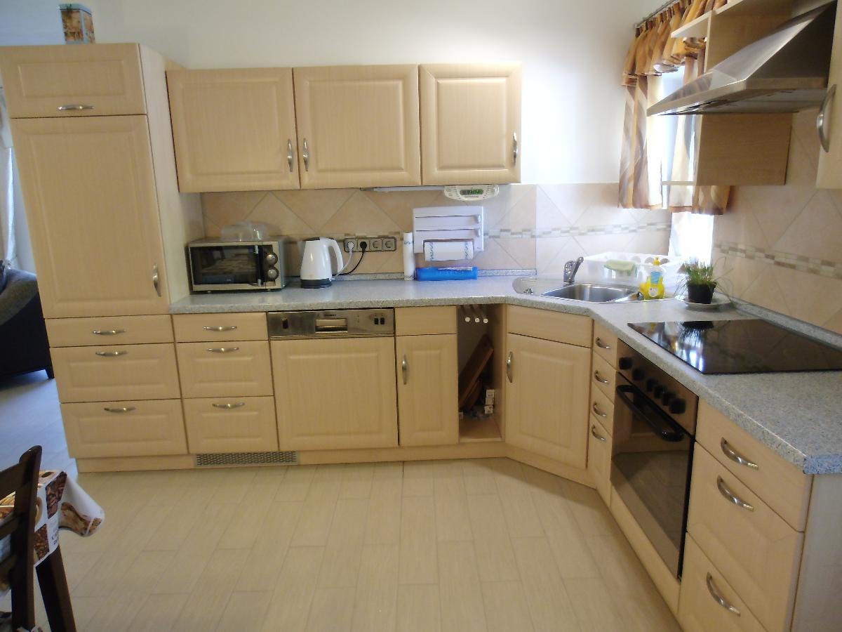 L-Einbauküche mit Geschirrspülmaschine, Ceranfeld mit Backofen, Mikrowelle, Wasserkocher, Kaffeemaschine, Toaster, Eierkocher, Besteck u. Essgeschirr wie Teller u. Tassen, Trinkgläser für mindestens 6 Personen, Gewürz Rondell, Essig u. Öl, freie Steckdosen uvm.